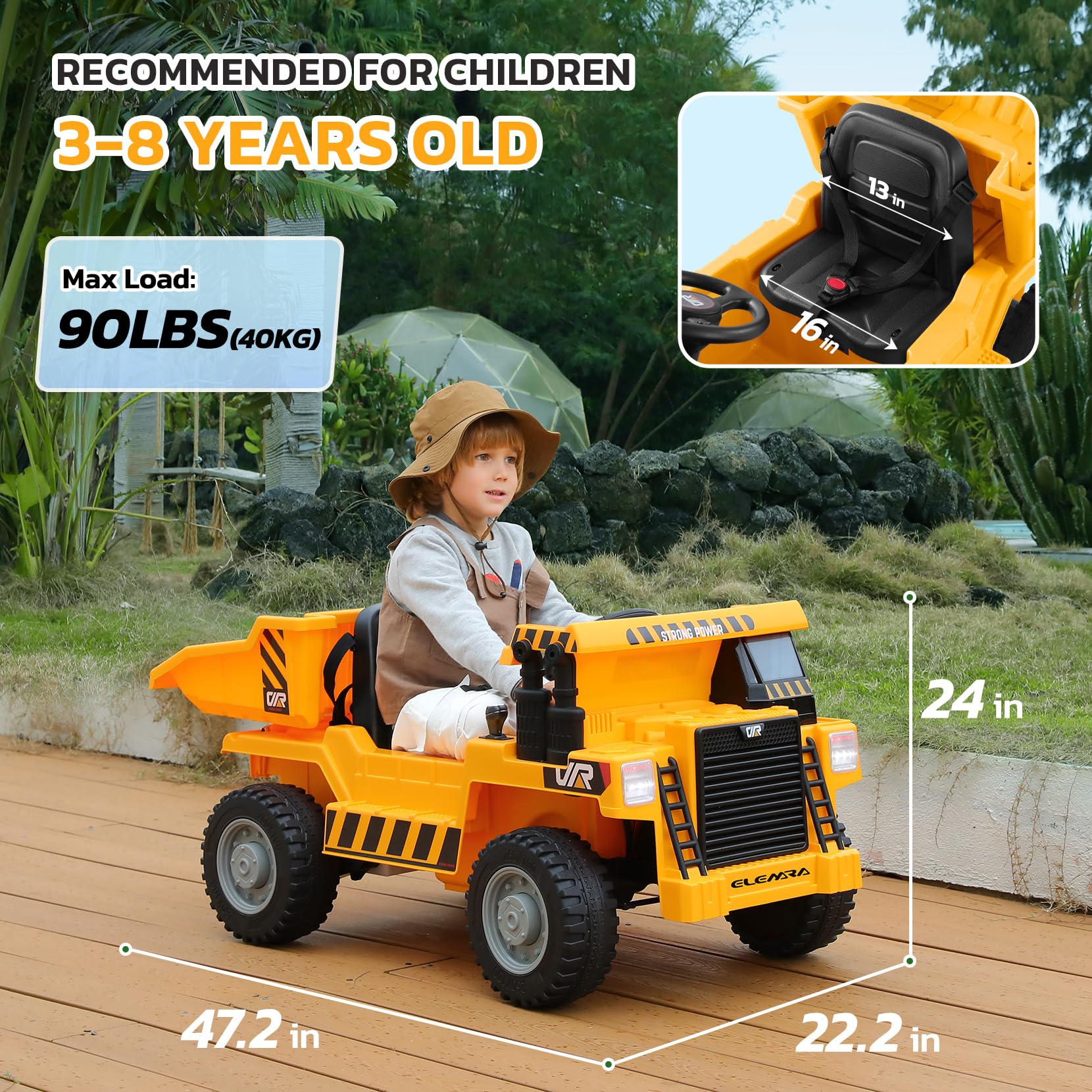 ?Not Only a Ride on Car?Say goodbye to ordinary kids electric car and your kids experience the joy of operating an electric ride on dump truck, complete with a cool lifting dump bed, shovel, Bluetooth, and music player. Keep your little porters improve their hands-on skills while having fun riding! | ?Spacious 15'' Seat for More Kids?ELEMARA ride on construction vehicle with user-friendly design. More space means to accommodate a variety of body sizes(up to 90 lb), ensuring a comfortable and enjoyable ride for everyone on board! Every child can hop on for a thrilling adventure! | ?12V 9AH Battery Car for Kids?Our ride on truck equipped with a powerful 12V 9AH battery for longer playtime. The high-quality tires ensure smooth rides on various surfaces like lawns, concrete road, tile road, gravel and more | ?Two Ways to Drive with Adjustable Speed?Kids can take the wheel for a realistic driving experience(2 adjustable speeds). Or parents can take control with the remote to added safety for the younger children(3 adjustable speeds). The ultimate in driving flexibility for little ones | ?Safety First? Our Ride on Dump Truck is equipped with top-notch safety features including soft start for smooth acceleration, one-button start design, seat with safety belt, lockable doors, and spring suspension. Every detail is designed to keep your kids ride in safety and style!