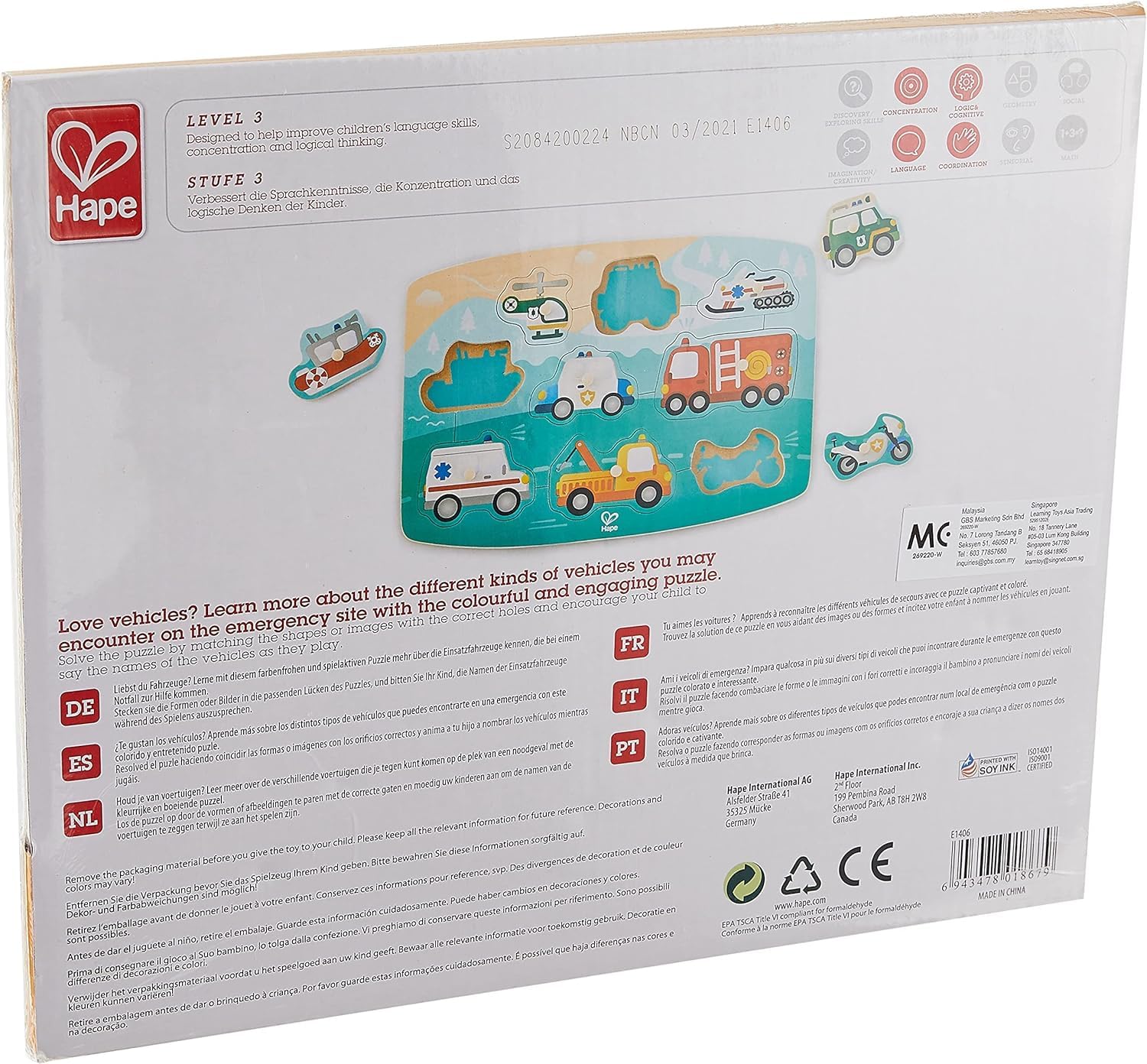 - Q: How does the puzzle help with child development? A: The Hape Emergency Peg Puzzle encourages cognitive development by helping children recognize and name different emergency vehicles, while also enhancing fine motor skills through peg handling.