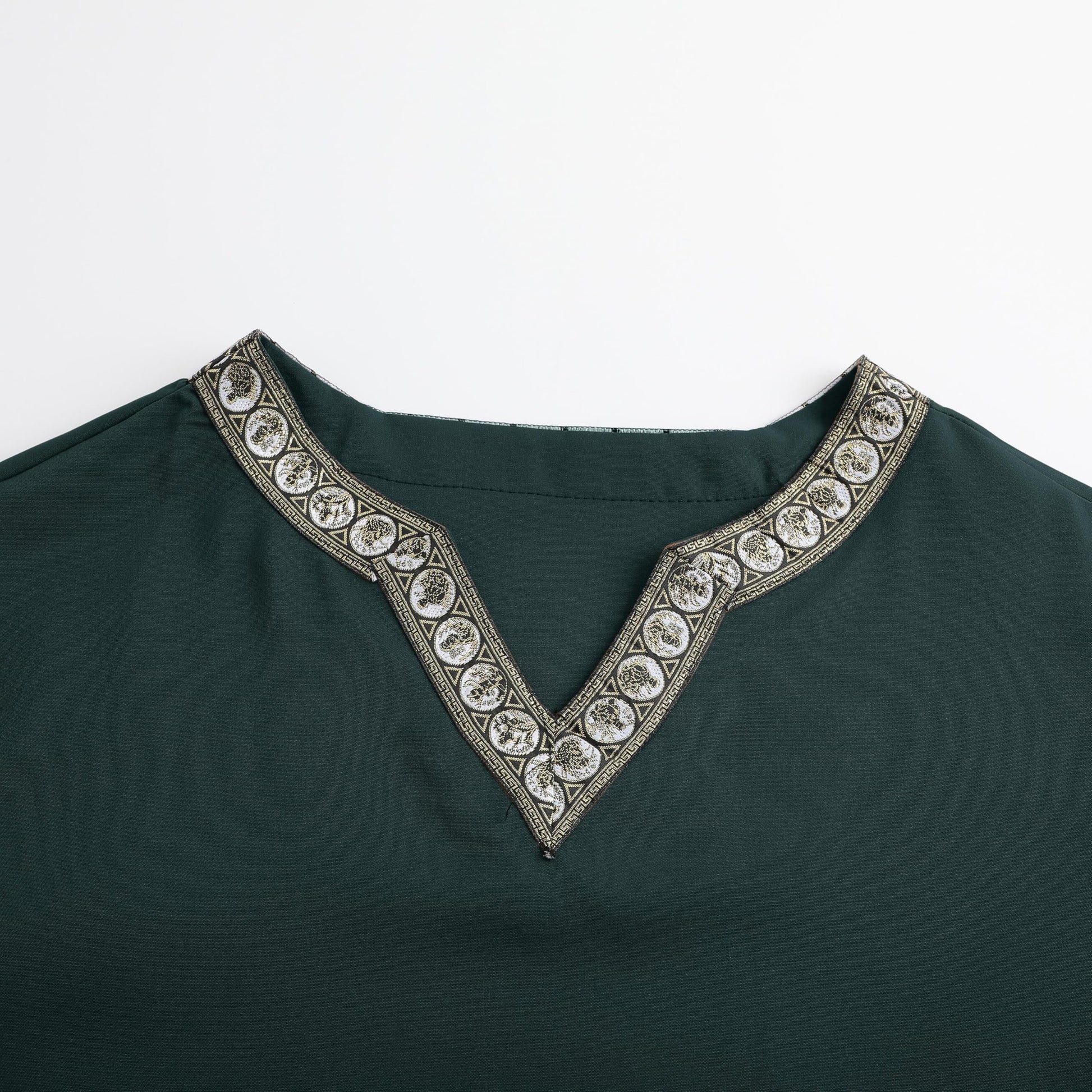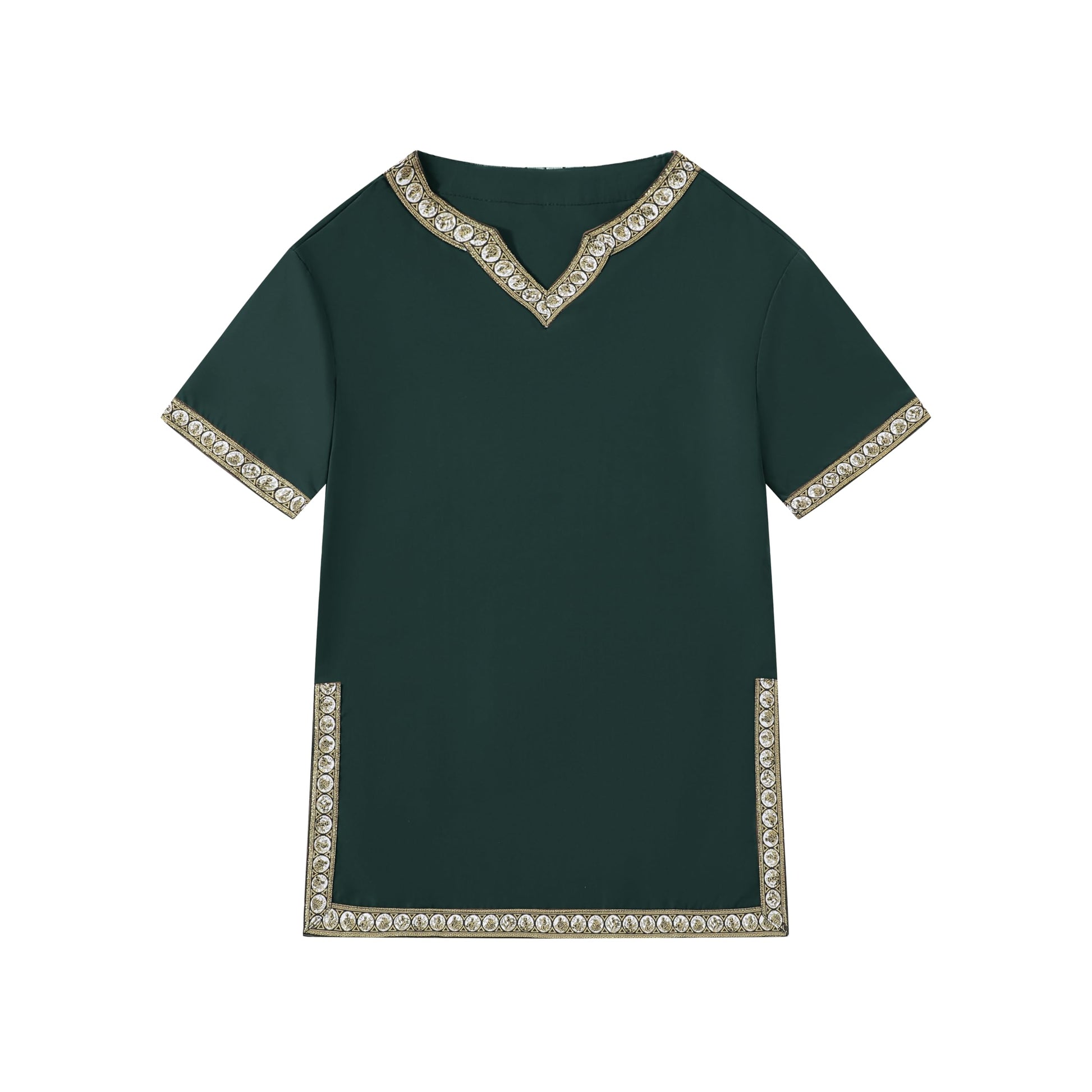 Attention: ? The belt is not include! Kids ,Medieval pirate costume tunic renaissance knight warrior viking LARP halloween tops are suitable for role playing game. | This boys short sleeve medieval tunic is made of cotton and polyester that makes the child feel soft when wearing it, does not feel stiff even if it comes into direct contact with the skin, and has excellent air permeability and does not suffocate the skin. | This children's medieval warrior archer knight V-neck tunic has a loose fitting design so you won't feel constricted in your other clothes. This boys colonial viking steampunk Caribbean Shirt features a unique embroidered trim design on the collar, cuffs, side slits and bottom circumference, giving the whole outfit a vintage, sophisticated and classic look. | Match Guideline: Your kids can pair the boys's retro viking tunic tops with belt, pirate pants, pirate hat and some dressing props for stage show, Dress this cosplay tops makes you stand out in the crowds. | This classic boys Halloween pirate costume is a perfect choice for cosplay show, stage performance, dress up party, stage play, medieval party,Halloween party, festival parade,renaissance festival,raduation party etc.Size:Available for 4-6Years/6-8Years/8-10Years/10-12/12-14 Years. This product is only suitable for children aged 4 and above.