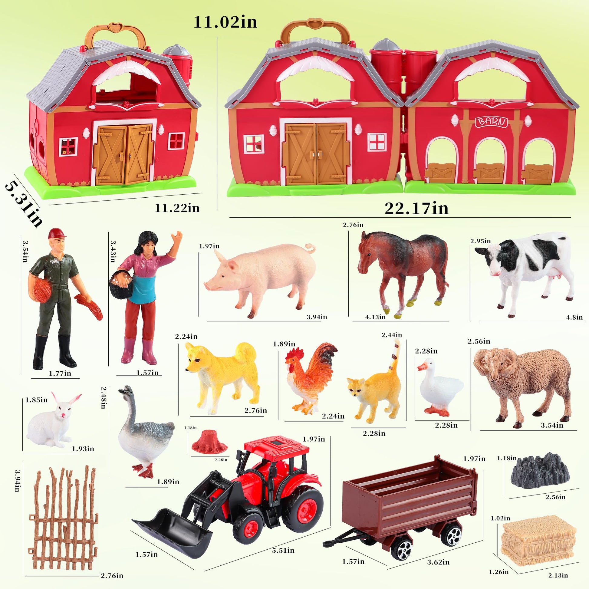 Enaurol Red Barn Farm Animals Toys, 28Pcs Animals Figures And Farm Tractor Playset, Educational Learning Toys For Toddlers And K
