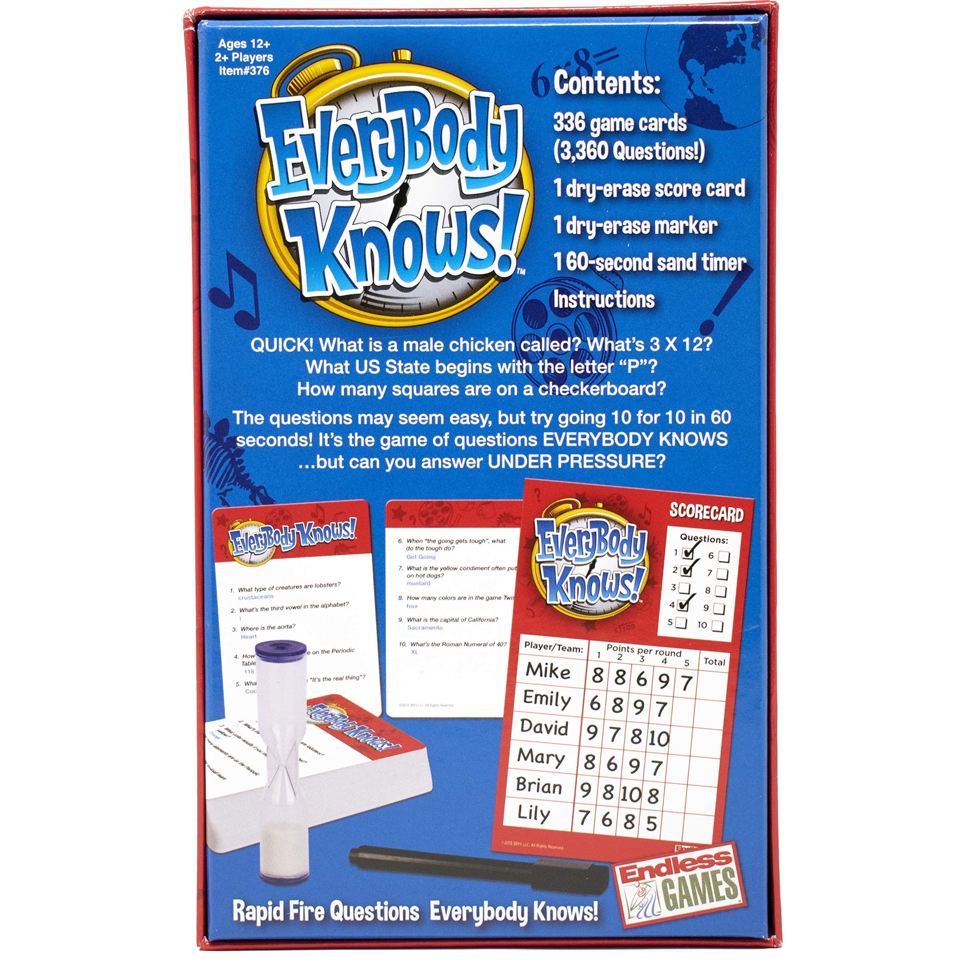 Everybody knows! Think youre the master of trivia? Used to answering faster than your friends or family? Test yourself under pressure with everybody knows, a high-intensity, fast-paced trivia card game that tests who can answer questions accurately and the fastest. Great for individual play against multiple people, or for team game night, this is the perfect, easy-to-play card game that gets everyone involved, having a blast, and testing their knowledge of pop culture, sports, movies, TV, and more! Product details: everybody knows (2018 edition) tabletop card game beginner friendly required players or teams: 2+ suggested ages: 12+ playing Time: 20 minutes or less includes all required pieces and instructions