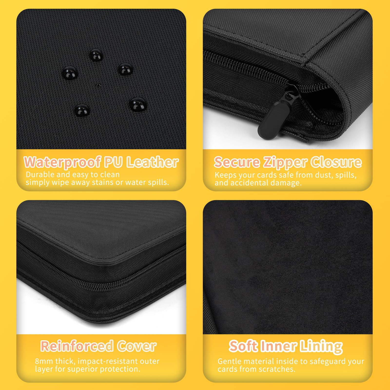 enhanced 1000+ Pockets Trading Card Binder - The Ultimate Solution for Card Collectors! Keep your trading cards organized se and easily accessible with this high-capacity binder. Perfect for TCG MTG Lorcana sports cards and more! Features: Large Capacity: 16 pockets per page with double-sided storage hold over 1000 cards making it ideal for avid collectors. enhanced Protection: Made with durable PU material a sturdy zipper closure and padded covers to protect your cards from dust spills and damage. Side-Loading Design: Hassle-free insertion and removal with side-loading game-style that prevent accidental card slips. Wide Compatibility: Fits standard-sized trading cards including TCG MTG Lorcana and sports cards. Durable & Travel-Friendly: Waterproof and non-slip materials ensure long-lasting use and make it easy to carry your collection anywhere. Upgrade your card organization with this stylish and durable trading card binder today!