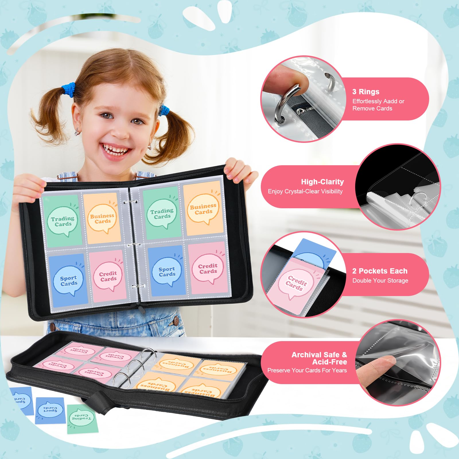 enhanced PU Materials - The surface of the Winsing card binder 4 pocket for game card is very soft and comfortable to touch and is waterproof and dirt-proof. If there is water or dust on the surface just wipe it with a paper towel. Large Capacity - Winsing binder for 400 cards can hold 400 cards including various standard size cards such as baseball card game card Football cards PECS cards Credit cards. Take It Anywhere - card binder 400 pockets has fulfilled wristband and small size which can be carried to school or friends' home to share with friends classmates. Sturdy Zipper - The sturdy zipper is smooth and durable. Once closed it can prevent the card from falling and losing. Product Specification: Size: 9.6 * 7 * 1.7 Pocket size: 2.6 x 3.6 for each pocketWeight:1.39 lbPages: 50 (Can be removed and added) Pockets: 400 Question: Q1:it suitable for various card collections?A1:Yes the card sleeves in this binder measure 2.6 x 3.6 making them suitable for most standard-sized cards. This includes game cards sports cards K-pop photocards coupons and more.