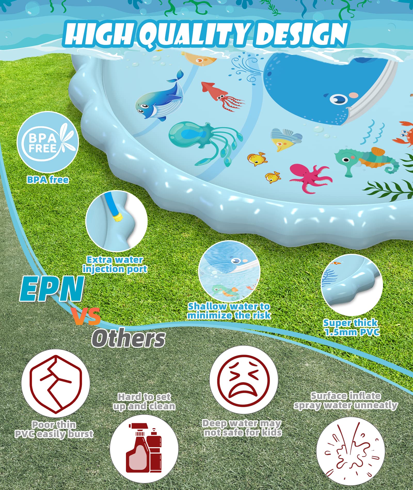 EPN Splash Pad, 102'' Size Extra Large Sprinkler Play Mat Fun for Kids, Thicker Summer Outdoor Water Toys Toddler Pool for 3-12 Years Old Children Boys & Girls