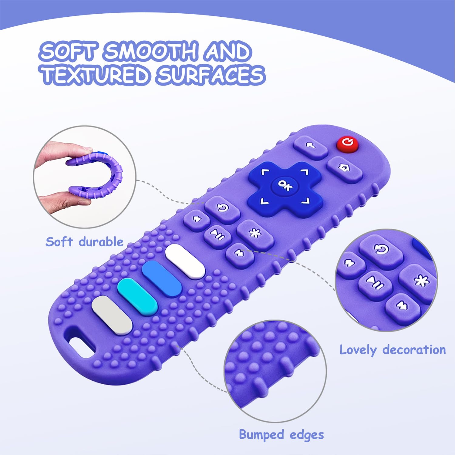 Safe Material - This remote control shaped teether is made of 100% food grade silicone, Non-Toxic, BPA freeThe soft and flexible baby silicone teething toys features one-piece design, no need to worry about falling apart, and thereAs zero choking hazard Relieve Teething Pain - The teething toys are designed with bumpy massage particles to help babies relieve discomfort during teething Perfect teethers for babies 3-18 months Safe for Baby - The babys silicone teething toy design idea comes from babies who like to bite the remote control, help your baby stay away from the real remote control and get a cleaner and hygienic tooth grinding experience Easy to clean - Hand wash or dishwasher safe Freezable Refrigerator Safe Heating without odor Recommended to use boiling water or steam to clean the teething toy for the first time erfect gift - These safe, stylish, multi functional teething toys set looks so beautiful ,they are perfect for teething baby great to be a shower or birthday gift for baby