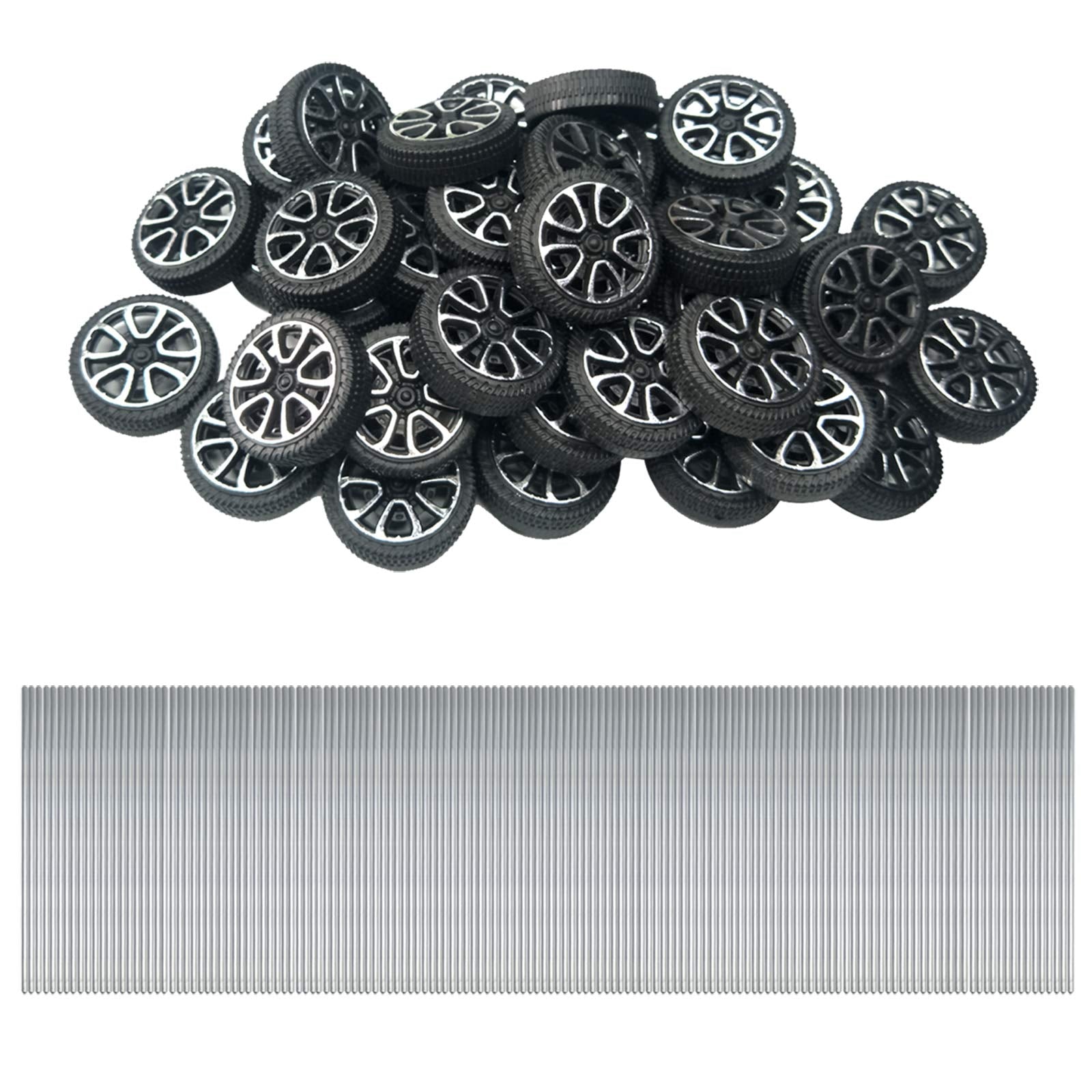 Toy wheels Features: Material: Plastic Main Color: Black, Silver Shaft Dia: 1.95mm/0.08''''. Suitable for 2mm shaft Diameter: 30mm / 1.2 ''. Tire width: 9mm / 0.36 ''. STEM shaft Features: -Length 100mm/3.9'''' -Diameter 2mm/0.08'''' Package include: 300 x Plastic Toys Wheel(30mmx9mm) 150 x STEM Shafts(2mmx100mm)