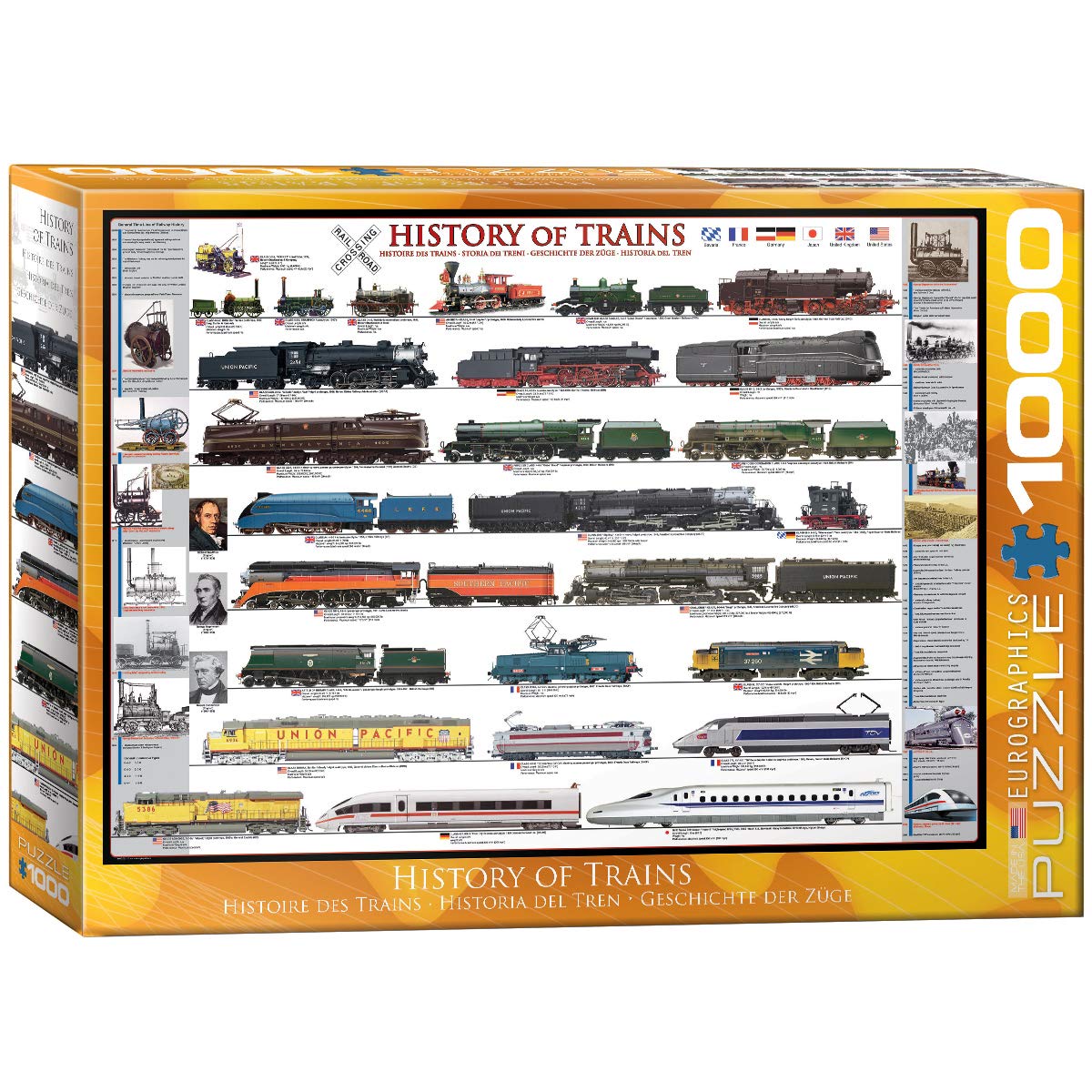 EuroGraphics History of Trains 1000-Piece Puzzle. Box size: 10' x 14' x 2.37'. Finished Size: 19.25' x 26.5'. Learn about the railway history with this fun and educative puzzle Strong high-quality puzzle pieces. Made from recycled board and printed with vegetable based ink. This superior quality puzzle will delight and educate all at the same time.