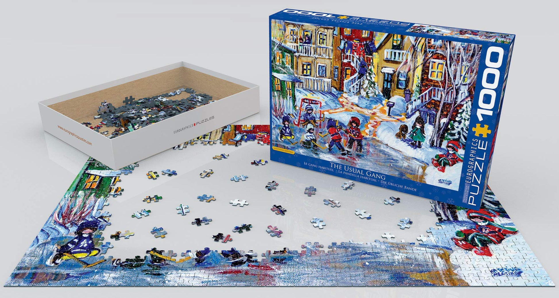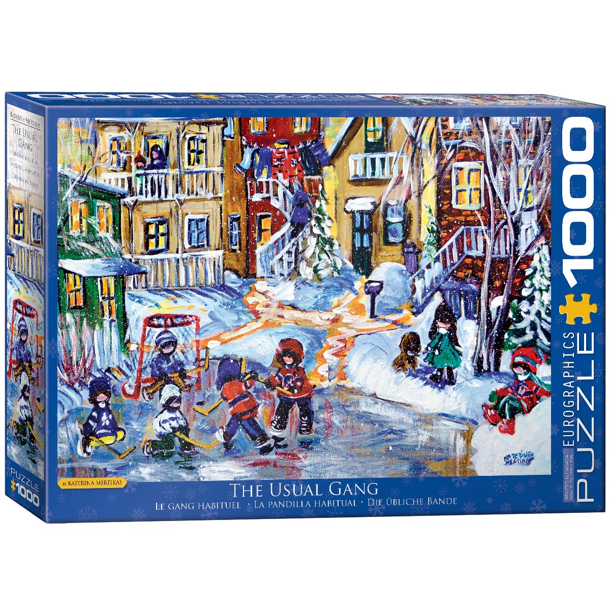 Box size: 10 x 14 x 2.37. Finished Puzzle Size: 19.25 x 26.5. Strong high-quality puzzle pieces. Made from recycled board and printed with vegetable based ink. EuroGraphics The Usual Gang by Katerina Mertikas 1000-Piece Puzzle. Katerina's artworks draws the viewer into a fun times gone by.