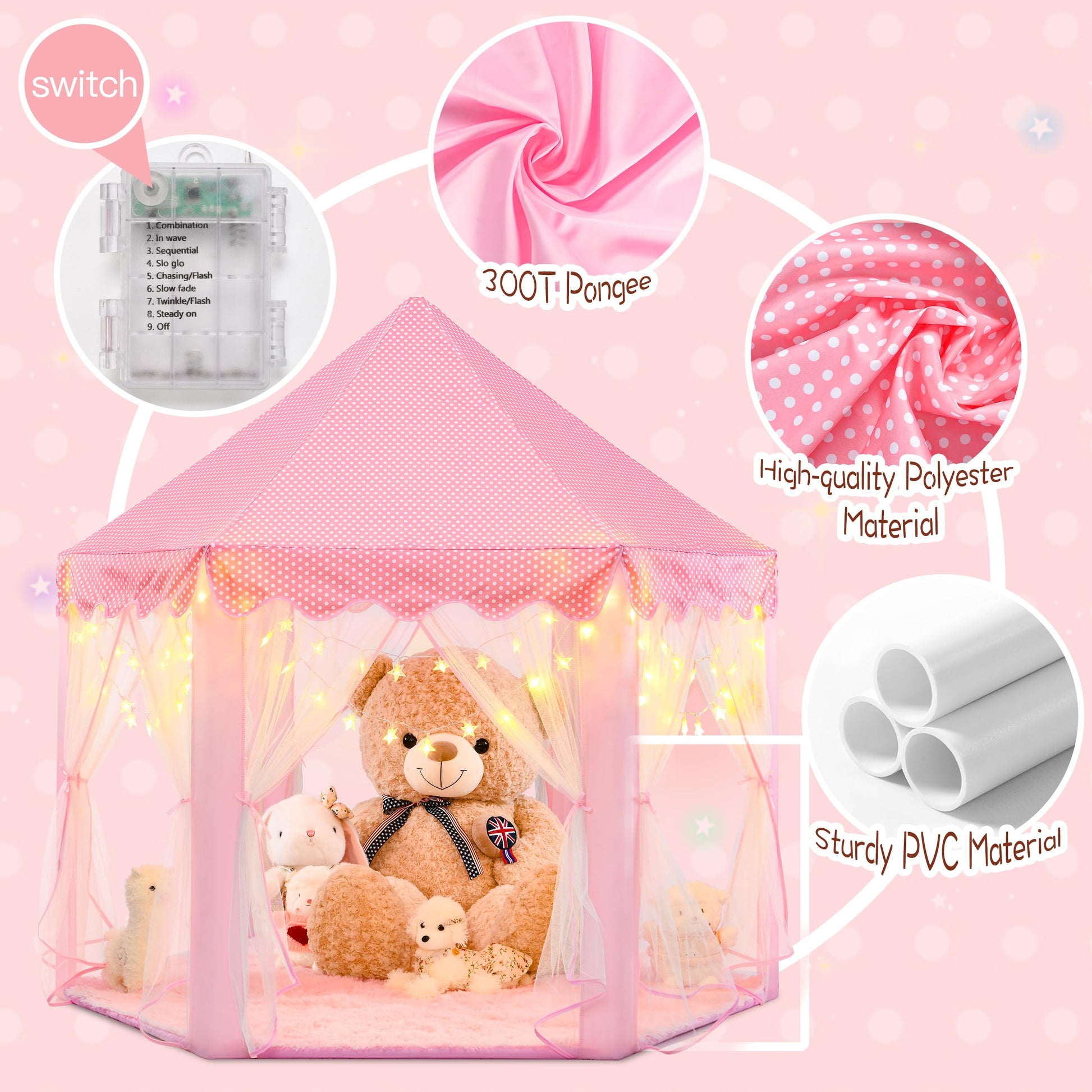 - Q: What makes this tent a great gift for kids? A: The EVOIONOS Princess Tent is designed to inspire imaginative play, and its beautiful pink color along with the light-up feature creates a magical atmosphere, making it a perfect surprise gift for any child.