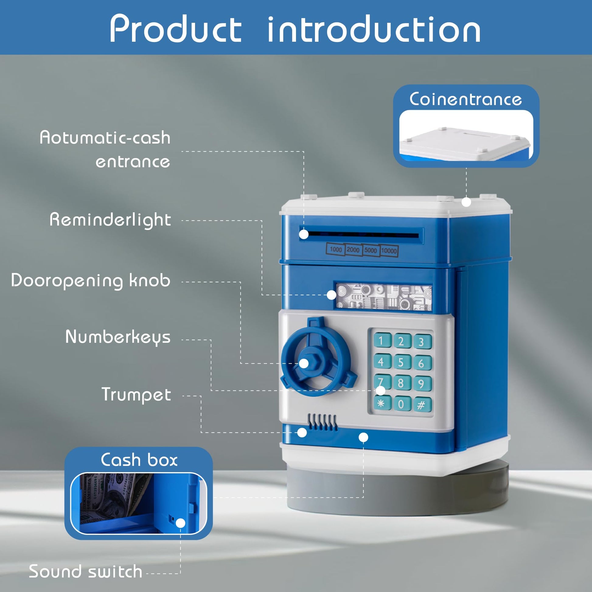 EVTHSU Blue Electronic ATM Safe Piggy Bank for Kids - Real Money Savings Coin Bank with Code Lock & Password, Gift Money Box for