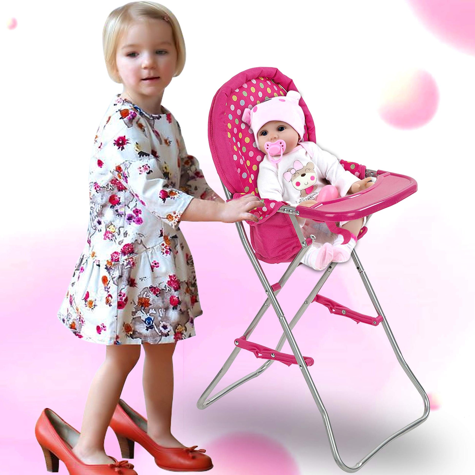 - Q: What features make the Baby Doll High Chair interactive? A: The high chair includes a feeding tray and a flower printed design, enhancing pretend play scenarios and encouraging creativity in children's playtime.
