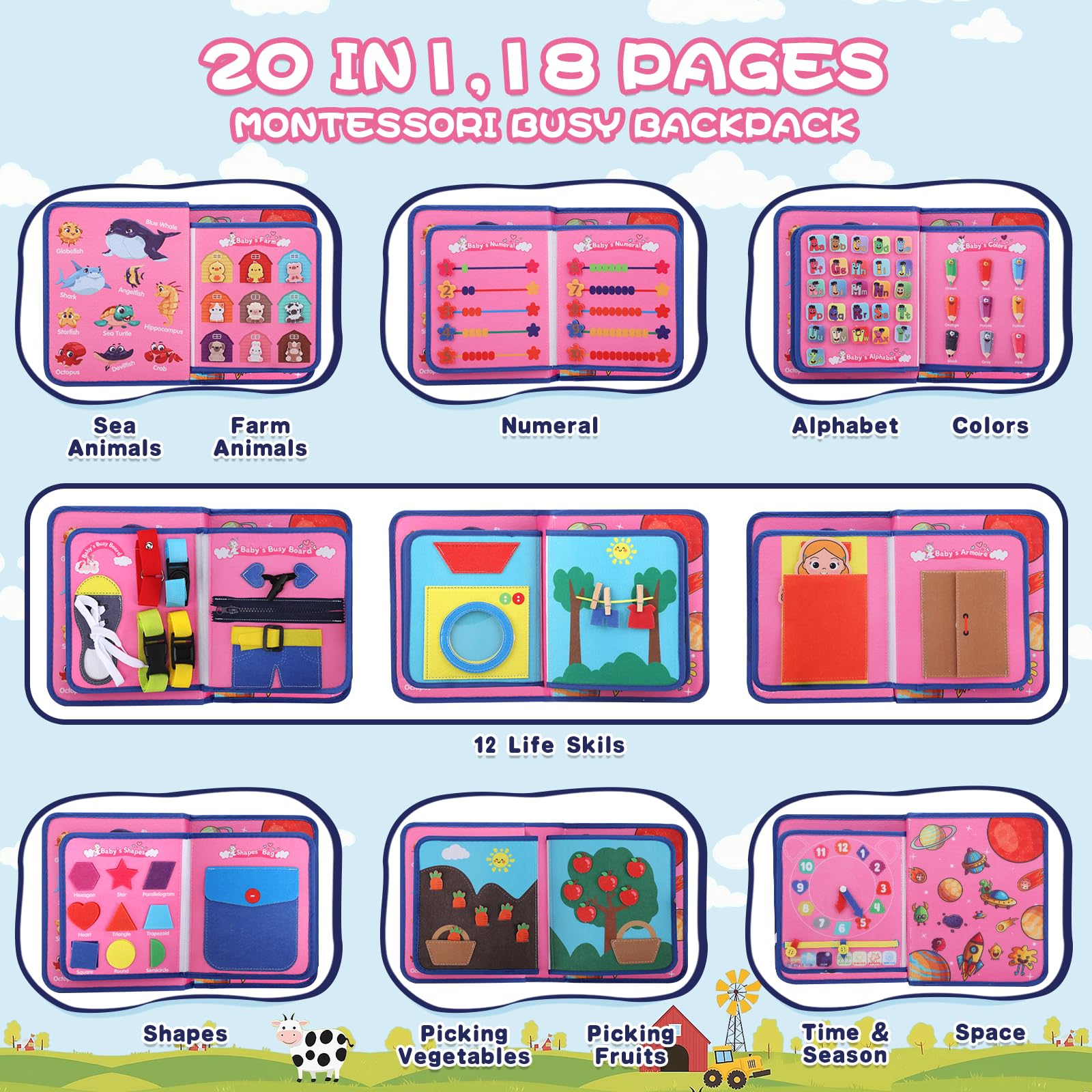 - Q: What types of activities are included in the busy board? A: The busy board features over 20 activities, including 12 life skills tasks such as dressing, buttoning, and tying shoes, as well as learning activities that cover sea animals, farm animals, shapes, colors, and more.