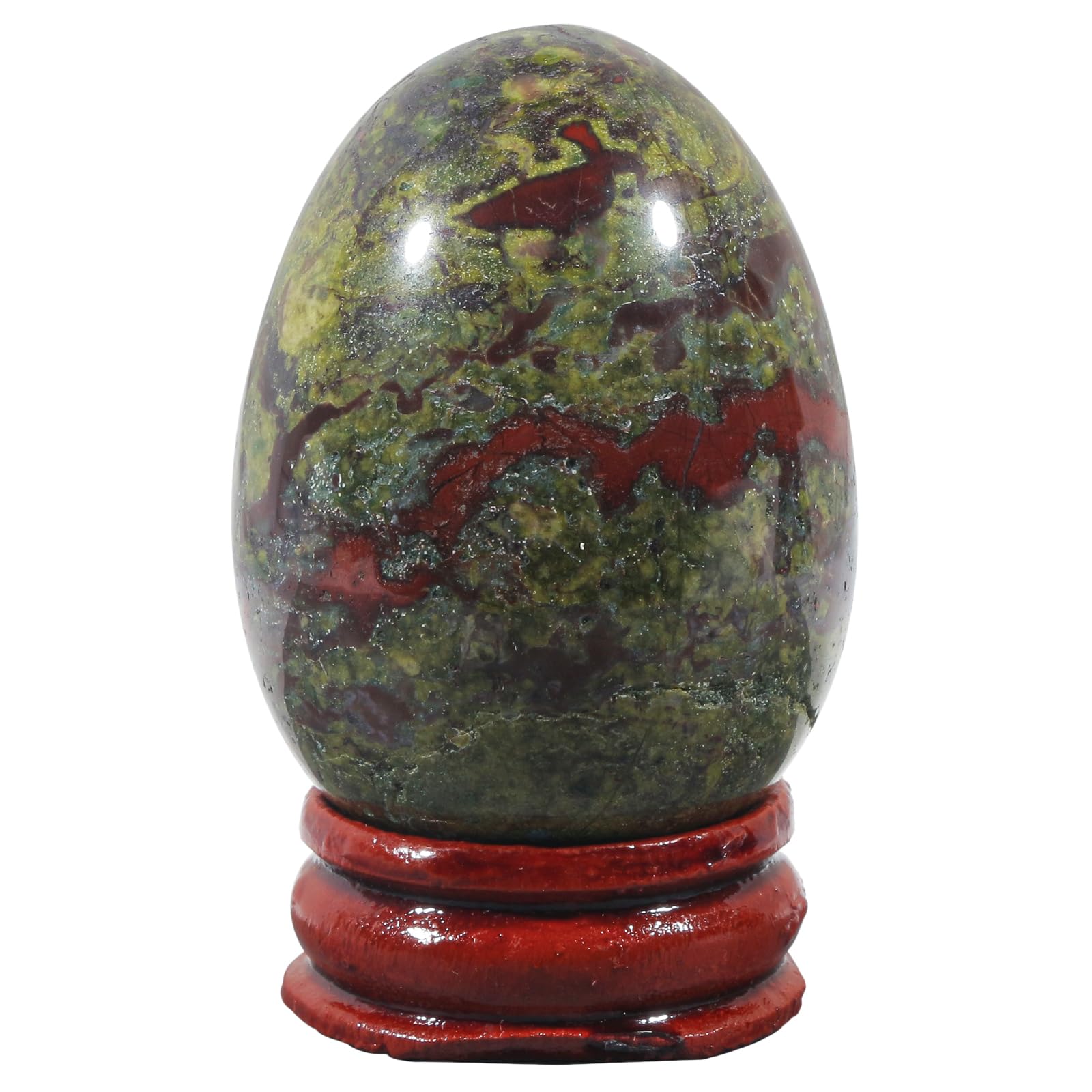 Fekuar Stone Egg Figurine, Polished Healing Crystal Easter Eggs Sphere Sculpture With Wood Stand, Natural Dragon Bloodstone, 1.8