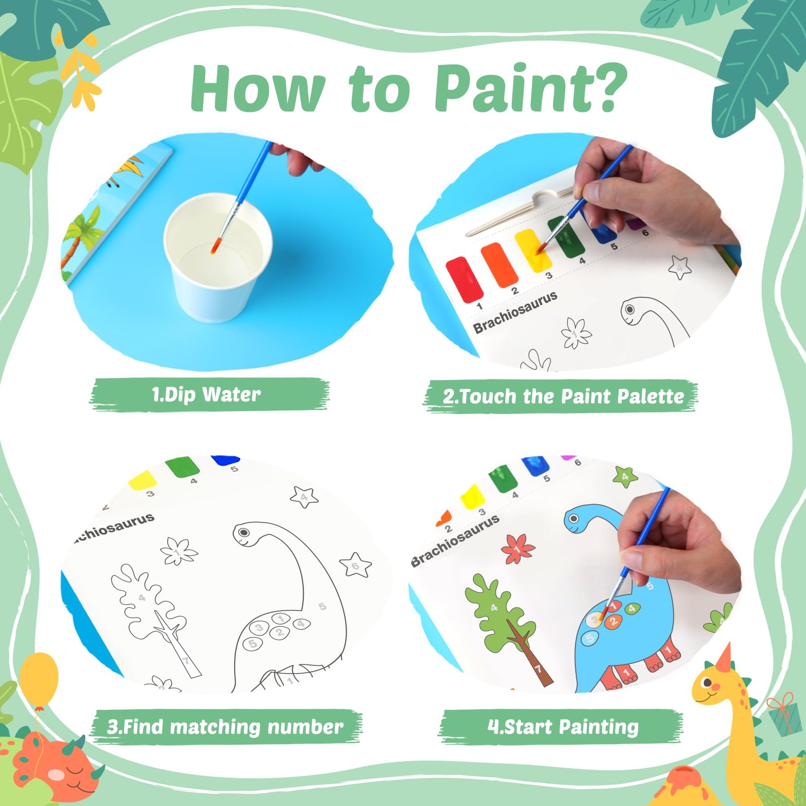- Q: How do you use the Paint with Water Coloring Book? A: To use the Paint with Water Coloring Book, simply wet the included paintbrush, moisten the paint palette on each page, and start painting. Each page features a fun dinosaur scene that kids can paint by numbers.