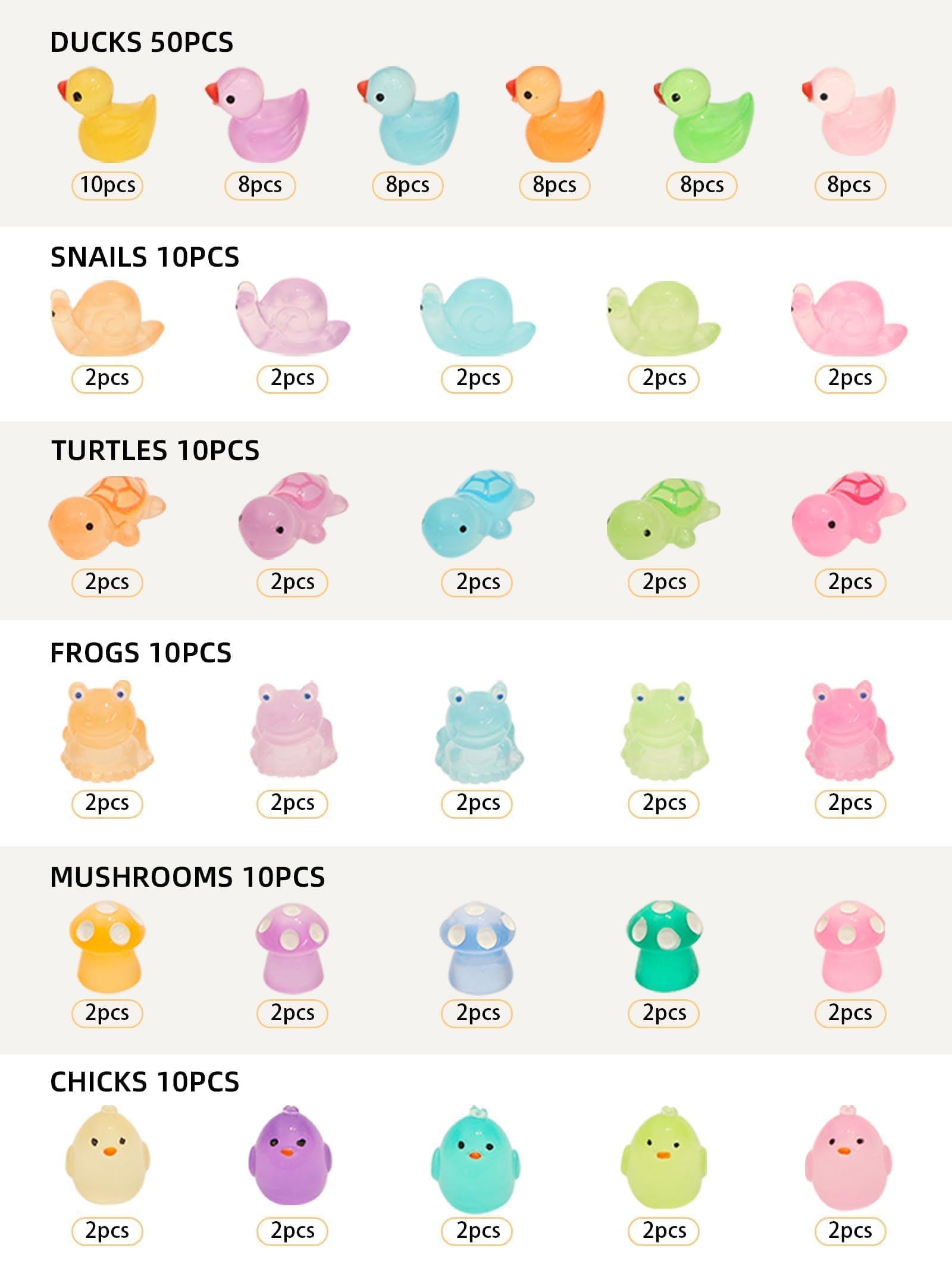 [What you will get]: You will receive 50 luminous ducks in 6 colors, 10 luminous frogs in 5 colors, 10 luminous snails in 5 colors, and 10 luminous mushrooms in 5 colors, 10 luminous chickens in 5 colors, and 10 luminous turtles in 5 colors. 6 product combinations come in matching sets. Tiny animals figures the quantity is enough to meet your diverse needs.[Package Size]: The mini duck measures approximately 0.6 x 0.67 inches. Made of durable and lightweight resin material.[High-Quality Material]: The cute mini bulk miniature duck characters are made of high-quality resin material, lightweight, easy to carry, more colorful, not easy to fade, and glow at night to be more attractive.[Luminous Design]: Micro ducks have unique luminous effects, they can absorb sunlight or light, the stronger the ultraviolet rays, the brighter they glow in the dark, the little resin ducks will glow during the day and night Bring you different experiences and add fun to your life.[Interesting Gifts & Wide Use]: You can use them to decorate dollhouses, make DIY miniature decorations, miniature fairy garden landscape decorations, fish tank and aquarium decorations, you can put these cute miniature garden decorations on plants, gardens , room, backpack, refrigerator, cupboard or anywhere on the table. Perfect birthday gifts, anniversary gifts, party favors, holiday gifts for Halloween and Christmas for friends and family.