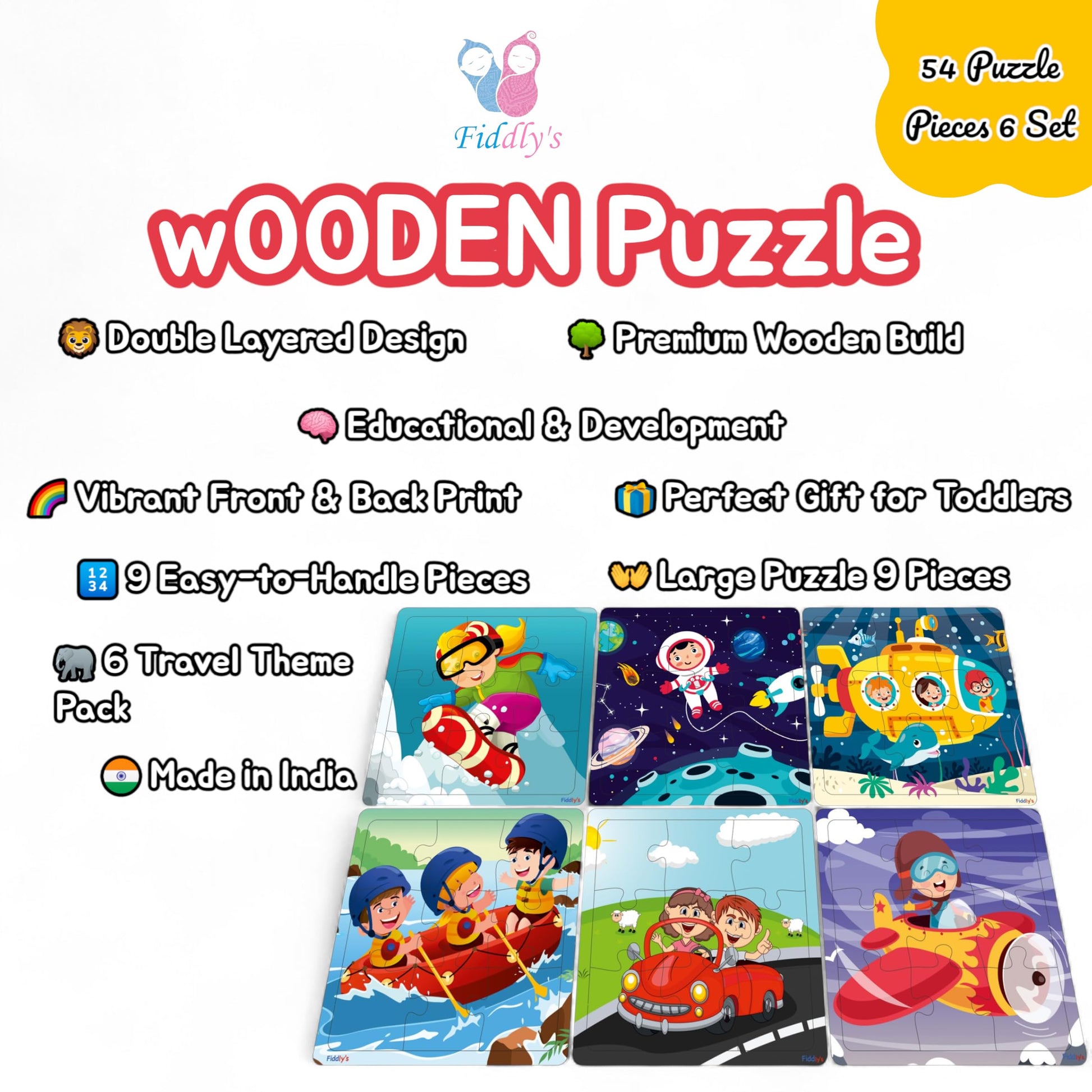 Fiddlys Wood Jigsaw Puzzles For Kids & Children -9 Pieces Age 3+ (Travel & Adventure (Pack Of 6))