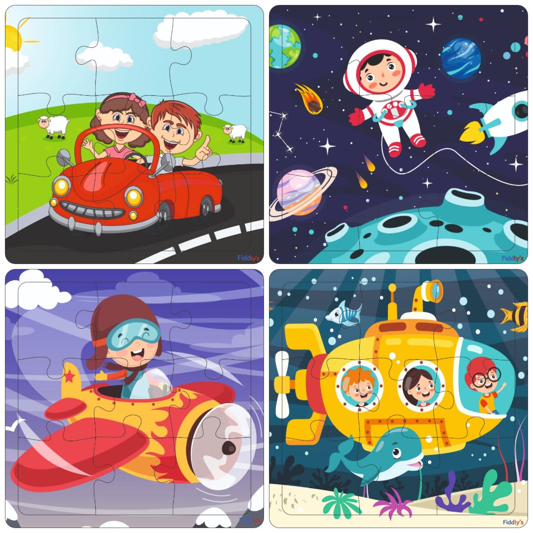 Fiddlys Wood Jigsaw Puzzles for Kids & Children -9 Pieces Age 3+ (Travel Pack of 4)