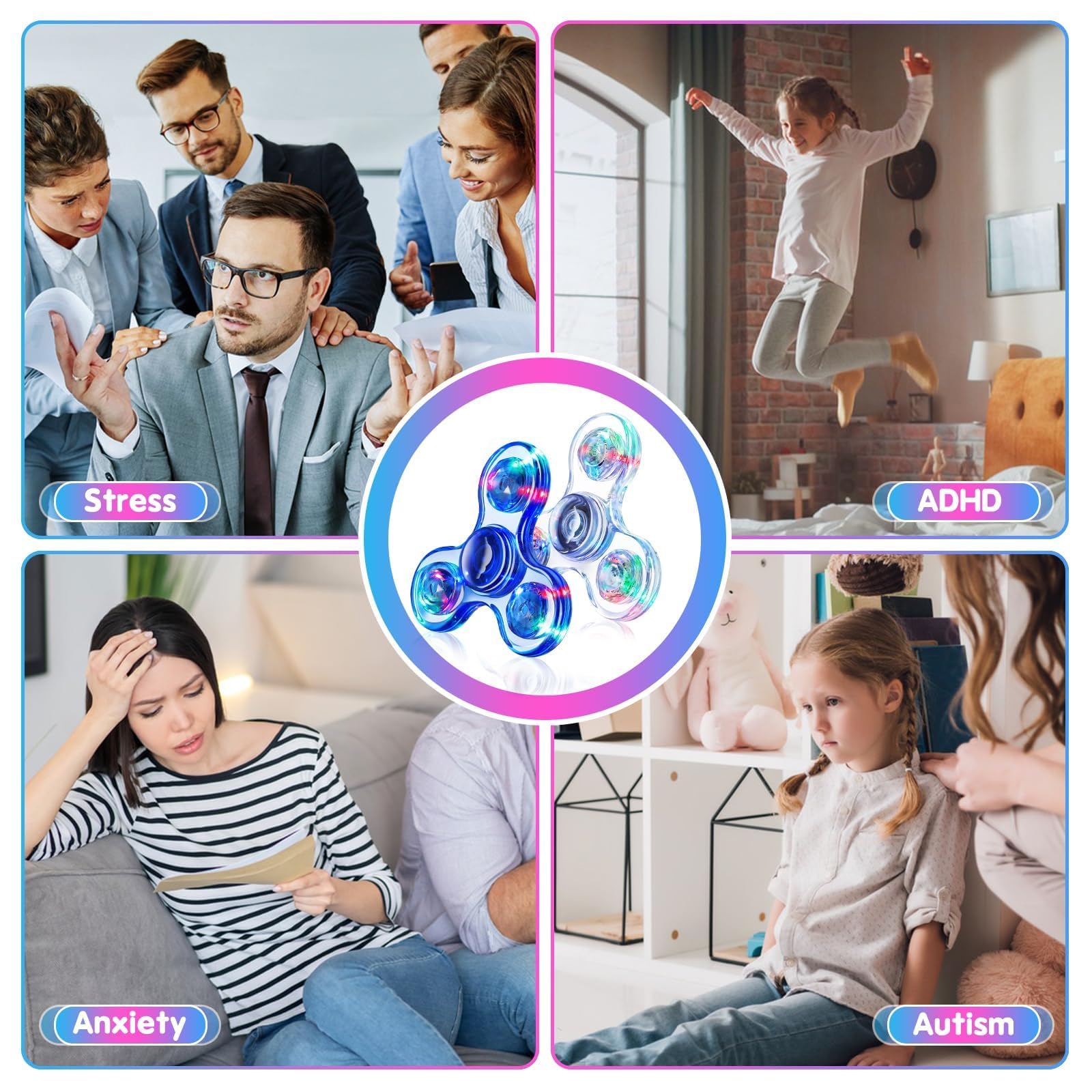 - Q: What age group is the Fidget Spinner suitable for? A: The Fidget Spinner is designed for kids ages 4 to 12, making it a great sensory toy for children with autism and ADHD. However, it can also be enjoyed by teens and adults who seek stress relief.