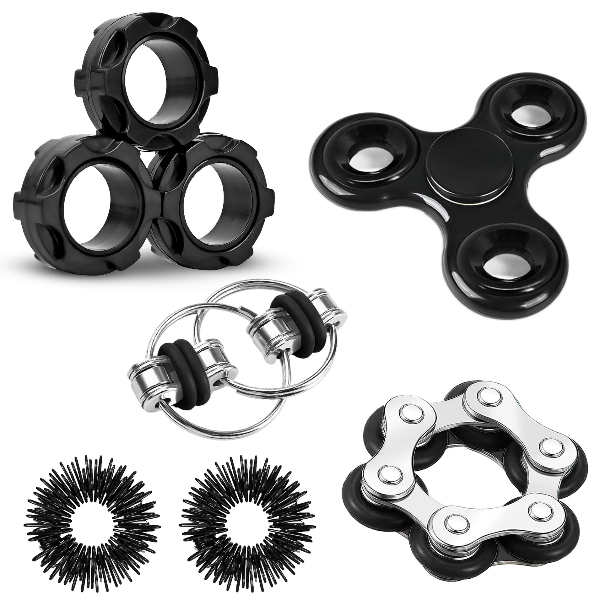 - Q: What types of fidget toys are included in the Dr.Kbder Fidget Toys Adults Pack? A: The Dr.Kbder Fidget Toys Adults Pack includes an assortment of fidget spinners, 3 magnetic rings, a roller bike chain, a flippy chain fidget toy, and 2 anxiety fidget rings, providing a variety of options for stress relief and focus.