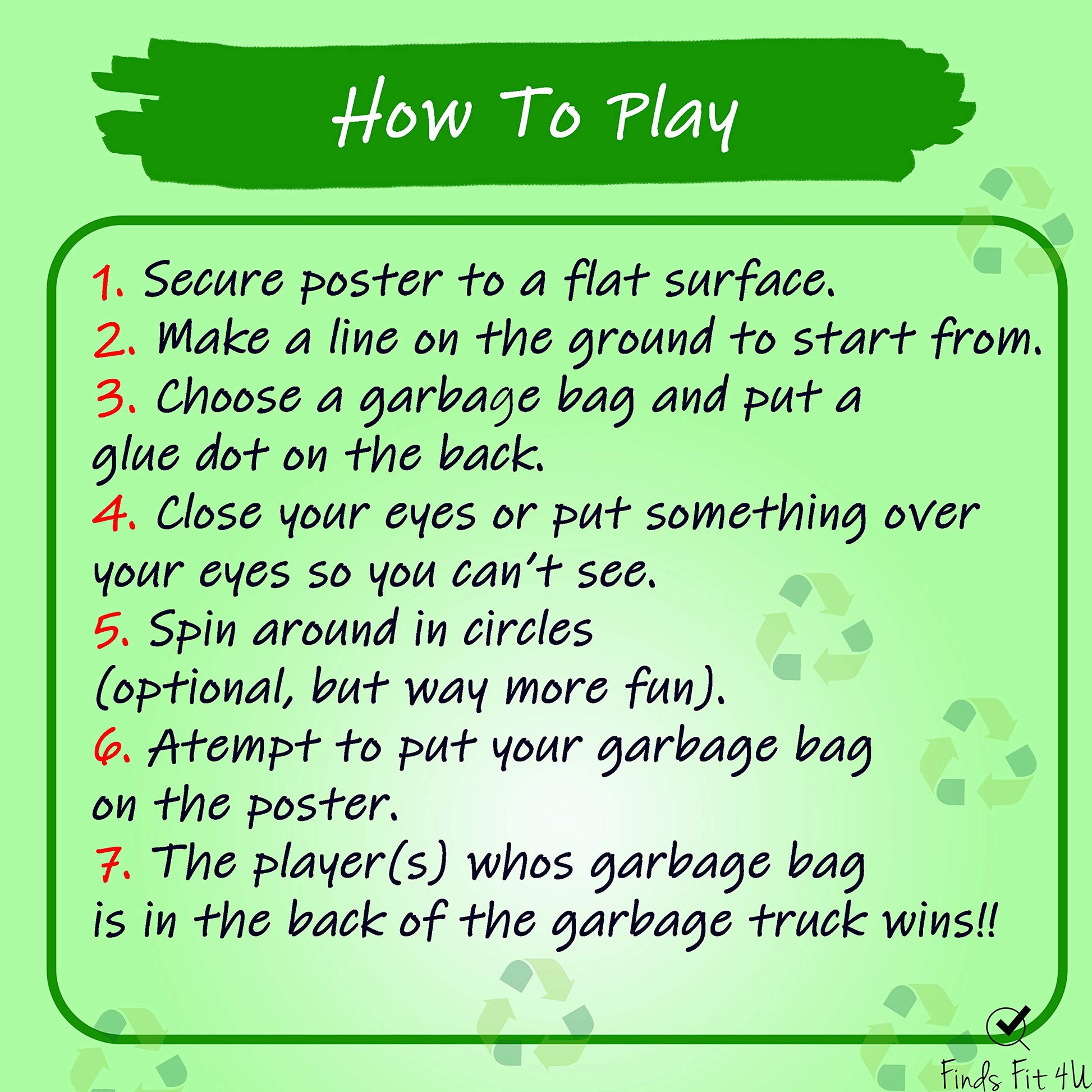 • Q: How do you play the Pin The Garbage on The Garbage Truck game? A: To play, secure the poster on a flat surface, mark a starting line, and have players take turns pinning a garbage bag on the truck while blindfolded. The player who places their bag closest to the designated spot wins.