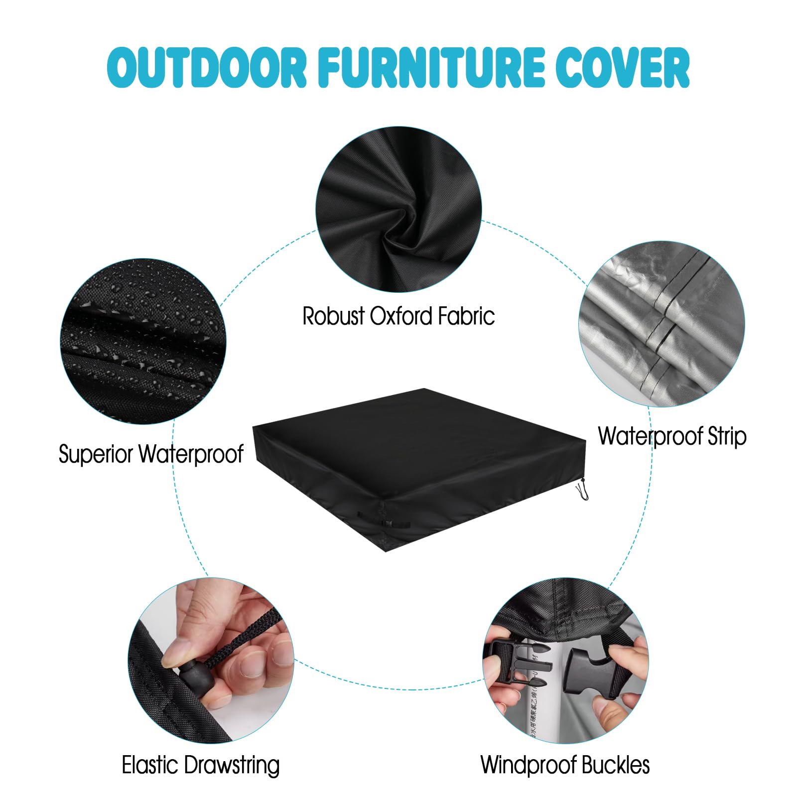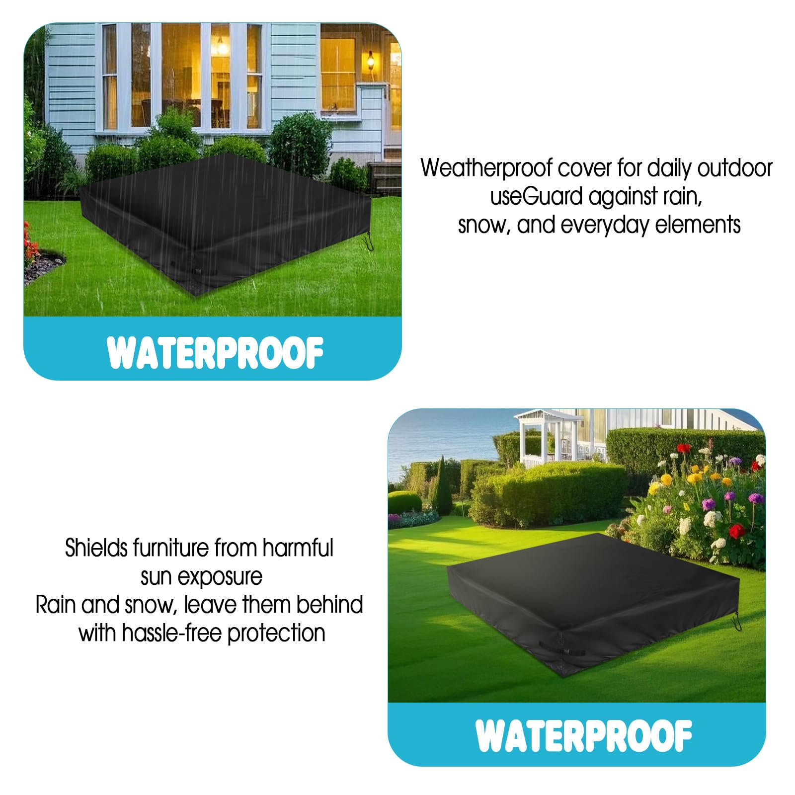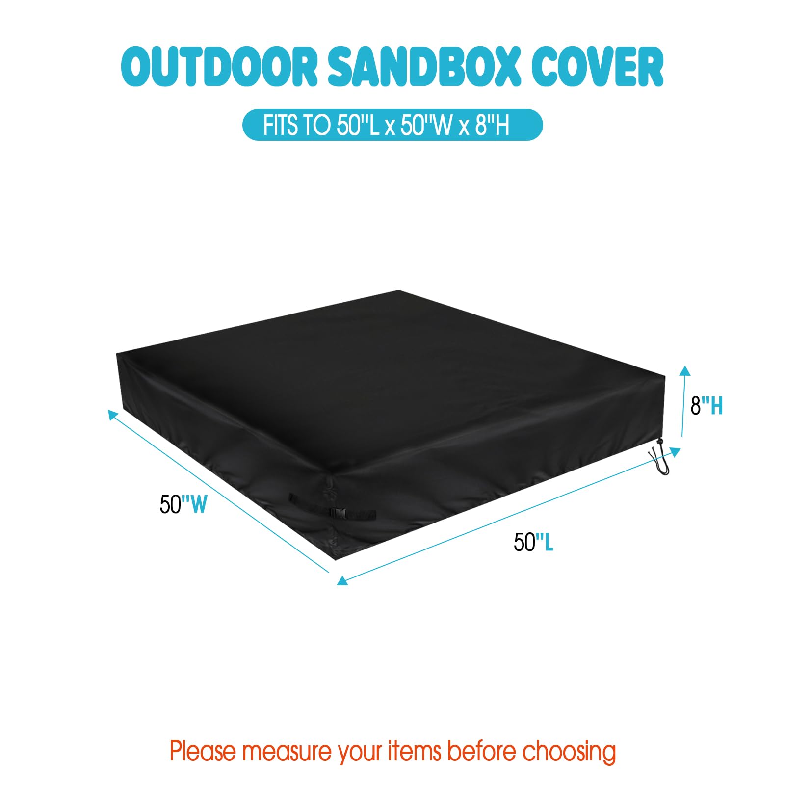 Protect your sandbox and toys with our newly upgraded 500D Oxford Fabric Sandbox Cover. Offering 3 kind of size options: 50''L x 40''W x 8''H Sand Box Cover 60''L x 60''W x 8''H Sand Box Cover 50''L x 50''W x 8''H Sand Box Cover Designed for all-weather protection,resistance to rain, snow, sun rays, and dirt, ensuring your sandbox stays clean and ready for play,no matter the season. Our innovative design features reinforced corner buckles and an adjustable drawstring, keeping the cover securely in place even during high winds.  Versatile protector can be used for pools, garden furniture, and toy storage box. Shield your beloved outdoor sand box with a cover built to last!