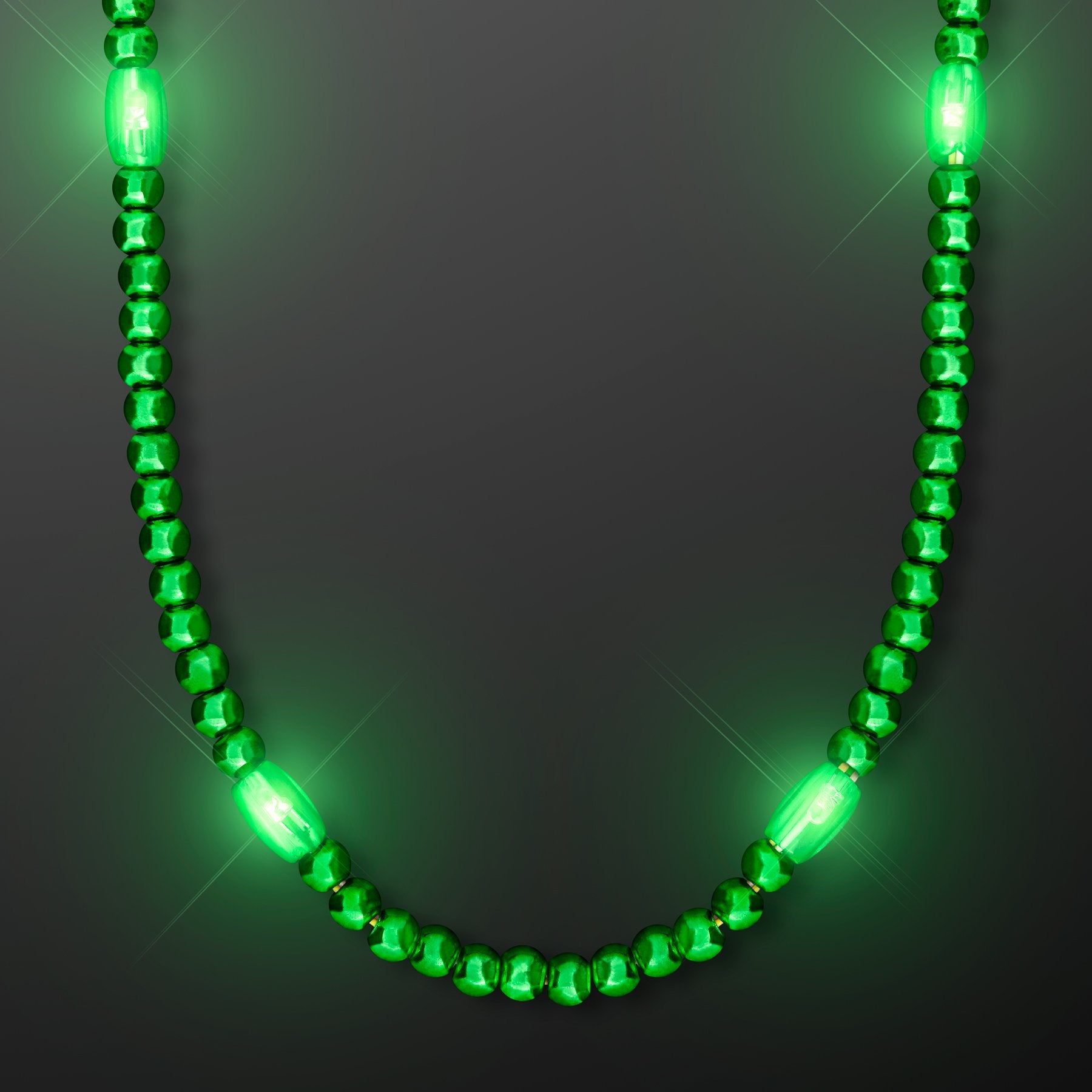 Green Glow LED Beads Mardi Gras Lights are an electrifying way to throw down on Mardi Gras, St. Patty's Day, or any occasion worthy of these killer beads. To activate your Green Glow LED Mardi Gras Beads, remove the battery protector and press the button for 1 of 3 light modes: Flash, blink and steady. NOTE: Item comes with 6 LED beads; the remaining beads are standard round Mardi Gras beads. LED Color: Green. Necklace Length: 30'' Green Glow LED Beads Mardi Gras Lights comes ready to use with 3 replaceable AG13 Batteries.