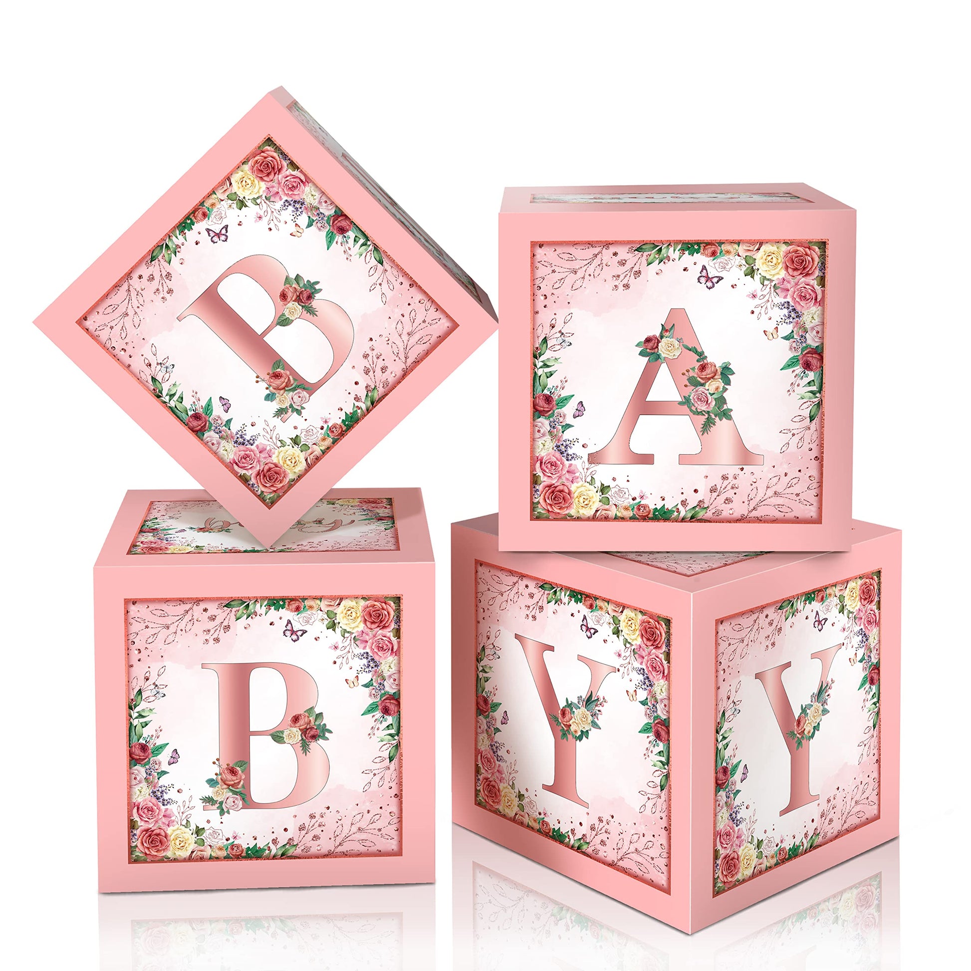 Floral Baby Shower Box Birthday Party Decoration Pink Balloon Blocks First Birthday Centerpiece Decor For Girls Rose Gold Gender Reveal Party Supplies