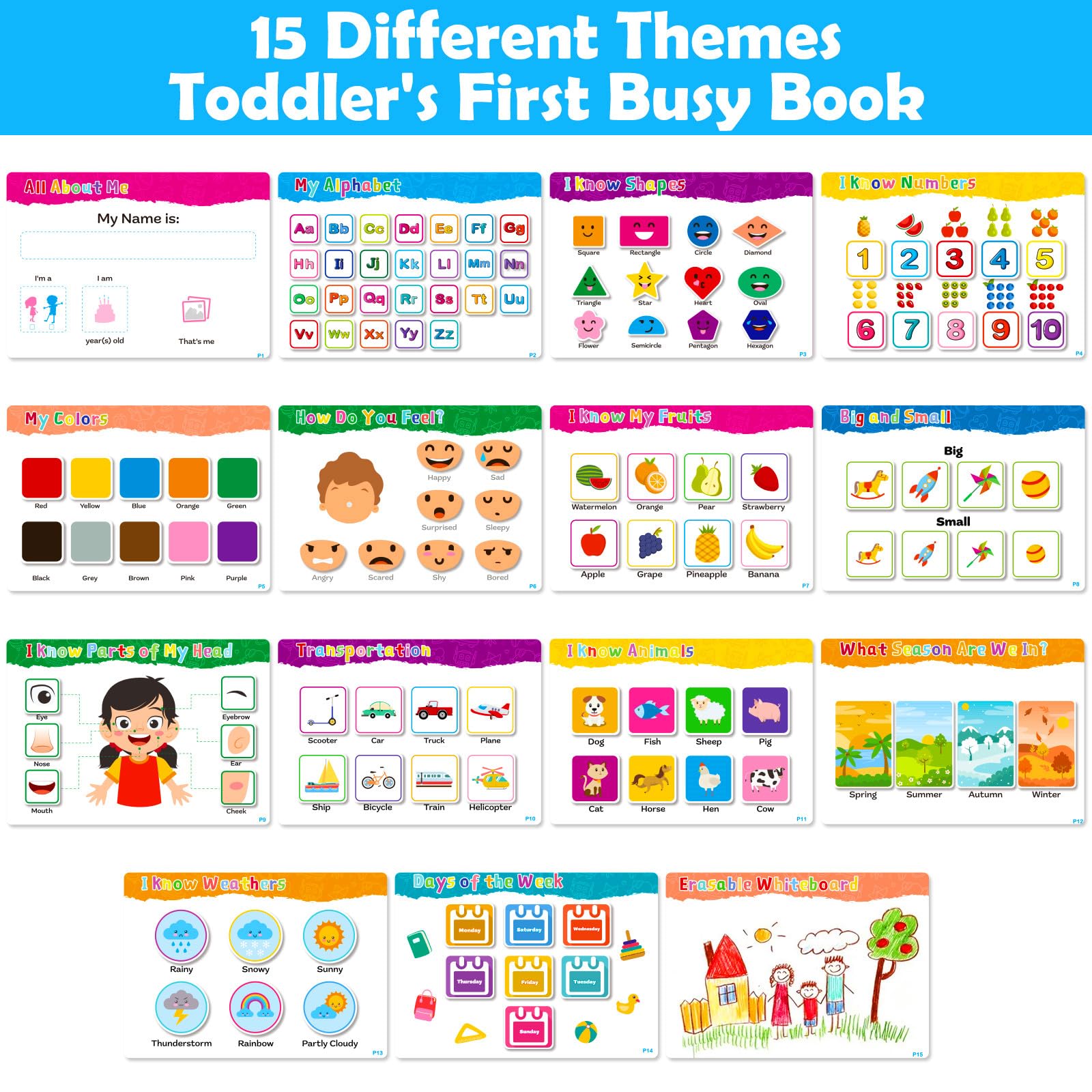 - Q: What themes are covered in the Foayex Toddler Toys activity book? A: The activity book features 15 themes, including the alphabet, numbers, shapes, colors, feelings, and more. This variety helps stimulate learning and creativity in young children.
