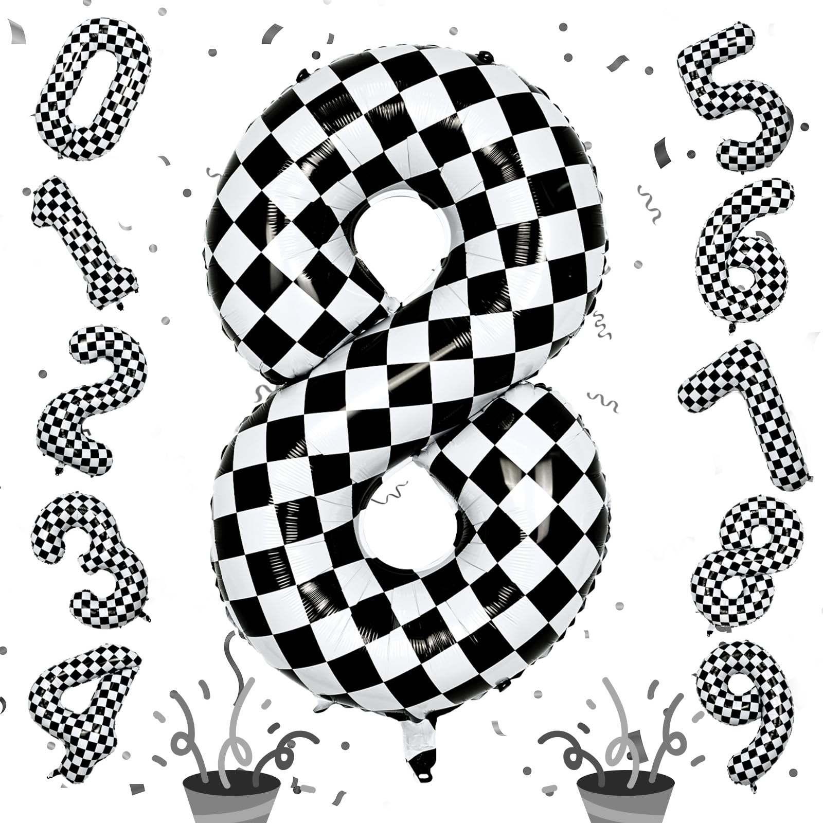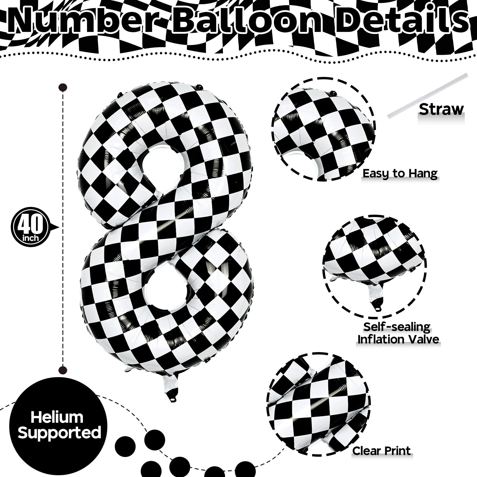 Foil 8Th Birthday Number Balloon, Large Checkered Helium 8 Racing Balloons Decor, 40 Inch Self Inflating Black And White Number