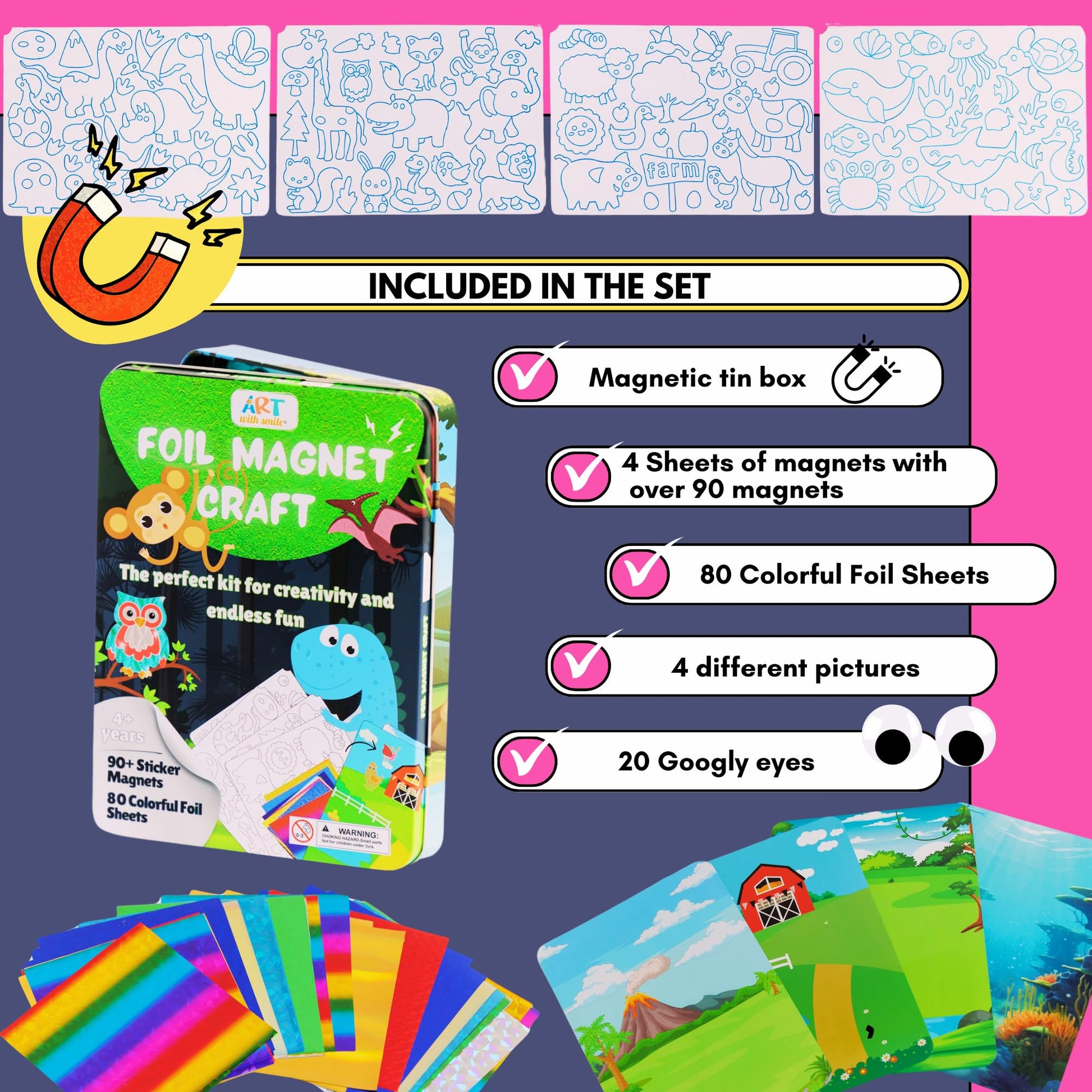 - Q: How do kids use the Foil Fun Art Kit? A: Kids can use the kit by mixing and matching colorful foil stickers and magnets to create their own scenes on the themed backgrounds.