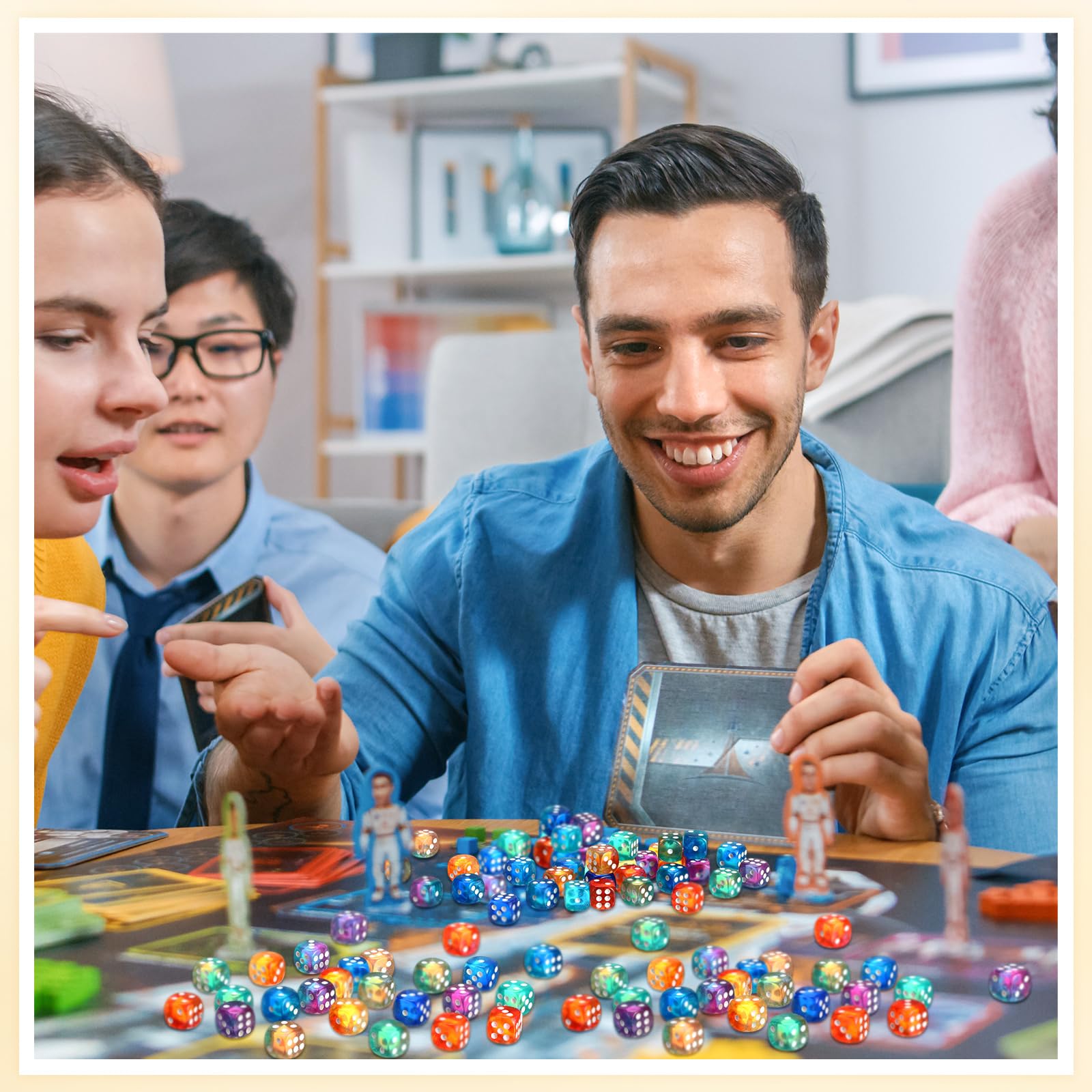 Features: Introducing our extraordinary 4 color dot dice set, a game changer for all gaming enthusiasts. This exceptional set includes a whopping 144 6-sided dice in 4 vibrant colors, accompanied by 4 convenient plastic boxes to keep your dice organized and easily transportable. With such an abundance of dice, you'll have an endless supply for endless gaming adventures with your family and gaming partners. Crafted with durability in mind, our dice are made from quality acrylic material. The smooth surface and clear, durable points ensure a consistent and satisfying roll every time. With their traditional pips, these dice are built to withstand endless gaming sessions without any signs of wear and tear or fading. Specifications: Material: acrylic Color: 4 colors Size: 12mm (0.47 inches) Package includes: 144 X 6-sided dice 4 x Plastic box Notes: Manual measurement, please allow slight errors on size. The color may exist a slight difference due to different screen displays. Suitable for people over 6 years old, and it's recommended to use under the supervision of adults in case of choking risk.