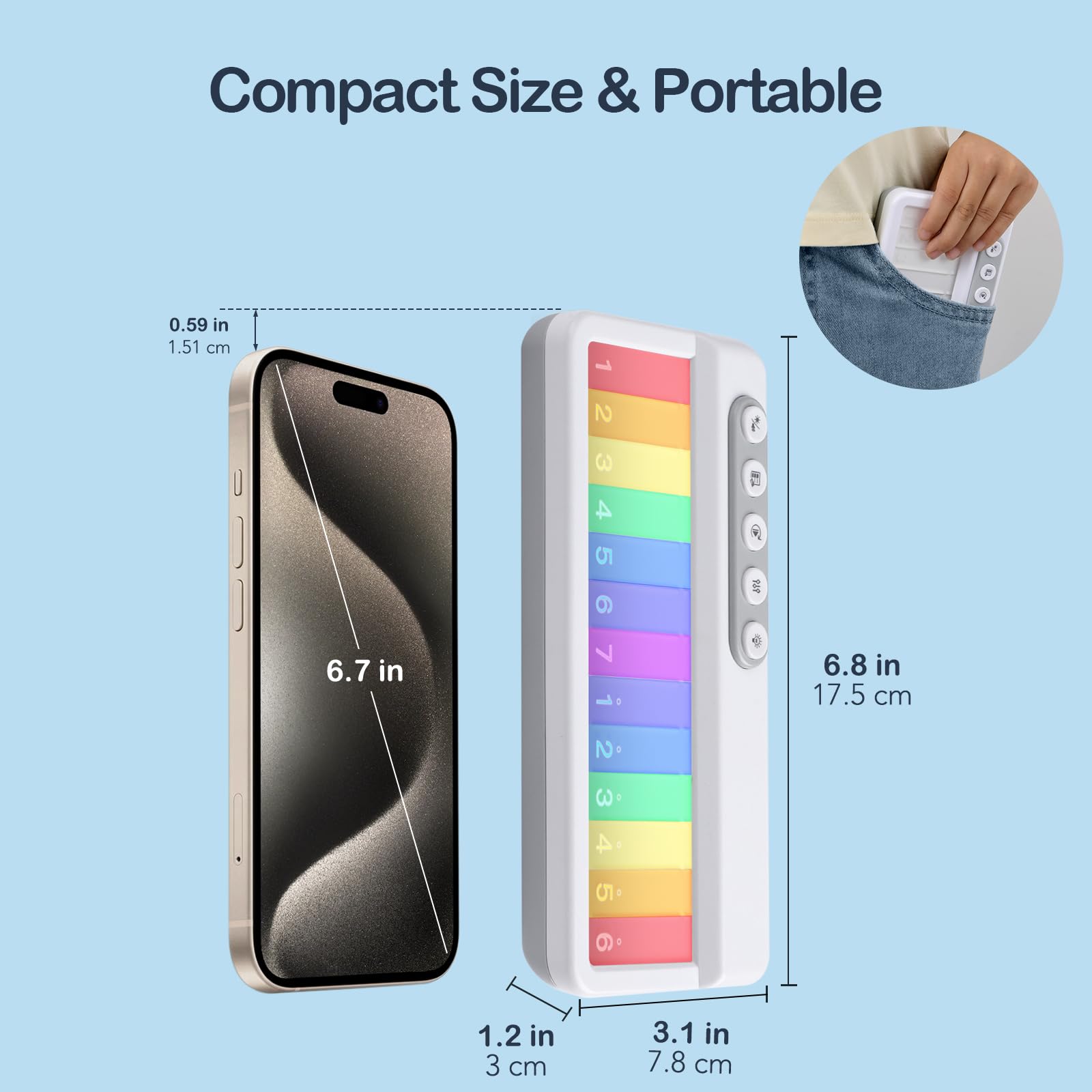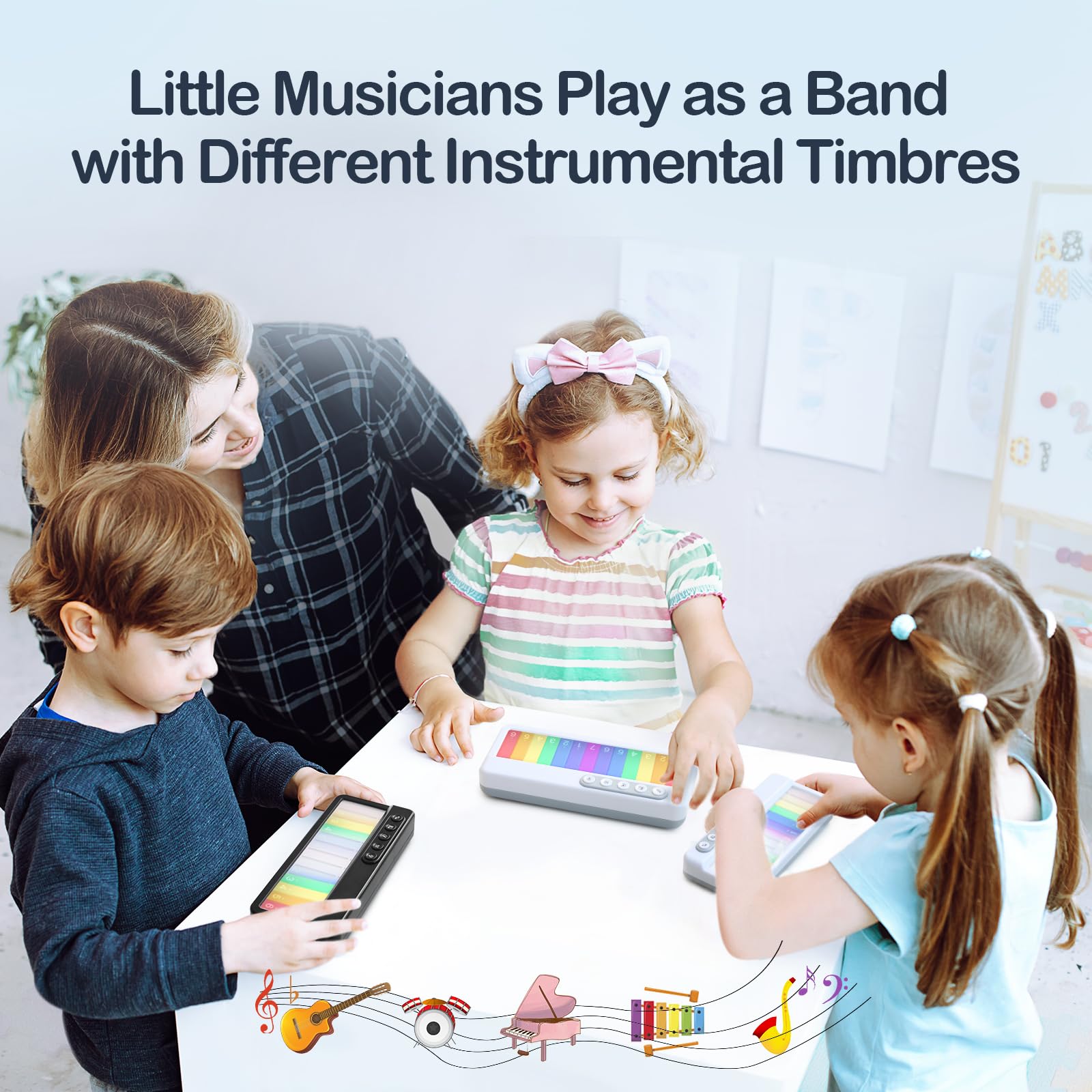 Portable Musical Toy: This mini keyboard piano toy is a perfect toddler toy and preschool toy, its compact size fits snugly into little hands, like a baby piano with small keyboard, making it an ideal companion children piano toy for age one to five; it doubles as a comfort toy providing bedtime music to little one Rainbow Lighting Effect: Entertain toddler with a light up piano keyboard that features safe, soft and comfortable array of rainbow-color lights, providing a visually appealing play experience that keeps kids engaged and makes every playtime magical. Rainbow brightness has three levels to adjust Five Instrument Sound Effects: This tiny piano toy ignites childrens music interest with multiple sound effects, including piano, xylophone, saxophone, guitar, and drums, allowing children to explore different music styles, encouraging creativity and making of their own unique tunes Twenty Feature-Rich Built-in Tunes: Designed as an educational toy for toddler, this mini piano toy comes with a learning mode in which child is guided by the illuminated key one by one to play along seven nursery melodies; thirteen more childrens songs are built in for demo Ideal Toddler Gift for Special Occasions: This pocket piano toy is a wonderful Christmas gift for kids, a thoughtful birthday gift, or a back to kindergarten gift that offers both entertainment and educational value, suitable for both boys and girls as a learning toy