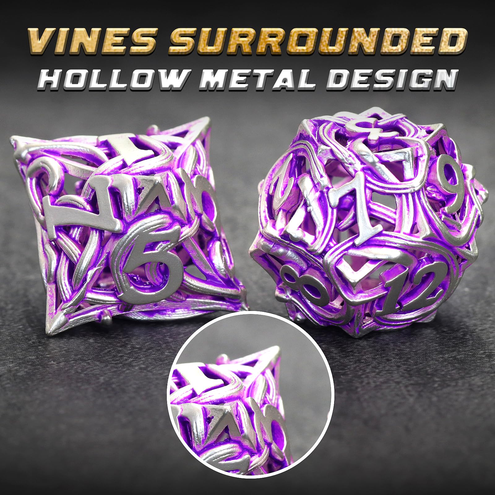 - Q: What are the key features of the FONVGOGO Metal DND Dice Set? A: The FONVGOGO Metal DND Dice Set features a unique vine design with recessed edges and sharp corners, making it visually appealing and easy to read. The hollow metal design keeps the set lightweight at around 60g, ensuring comfortable rolling. Additionally, the durable coating prevents wear and tear, maintaining the dice's vibrant appearance over time.