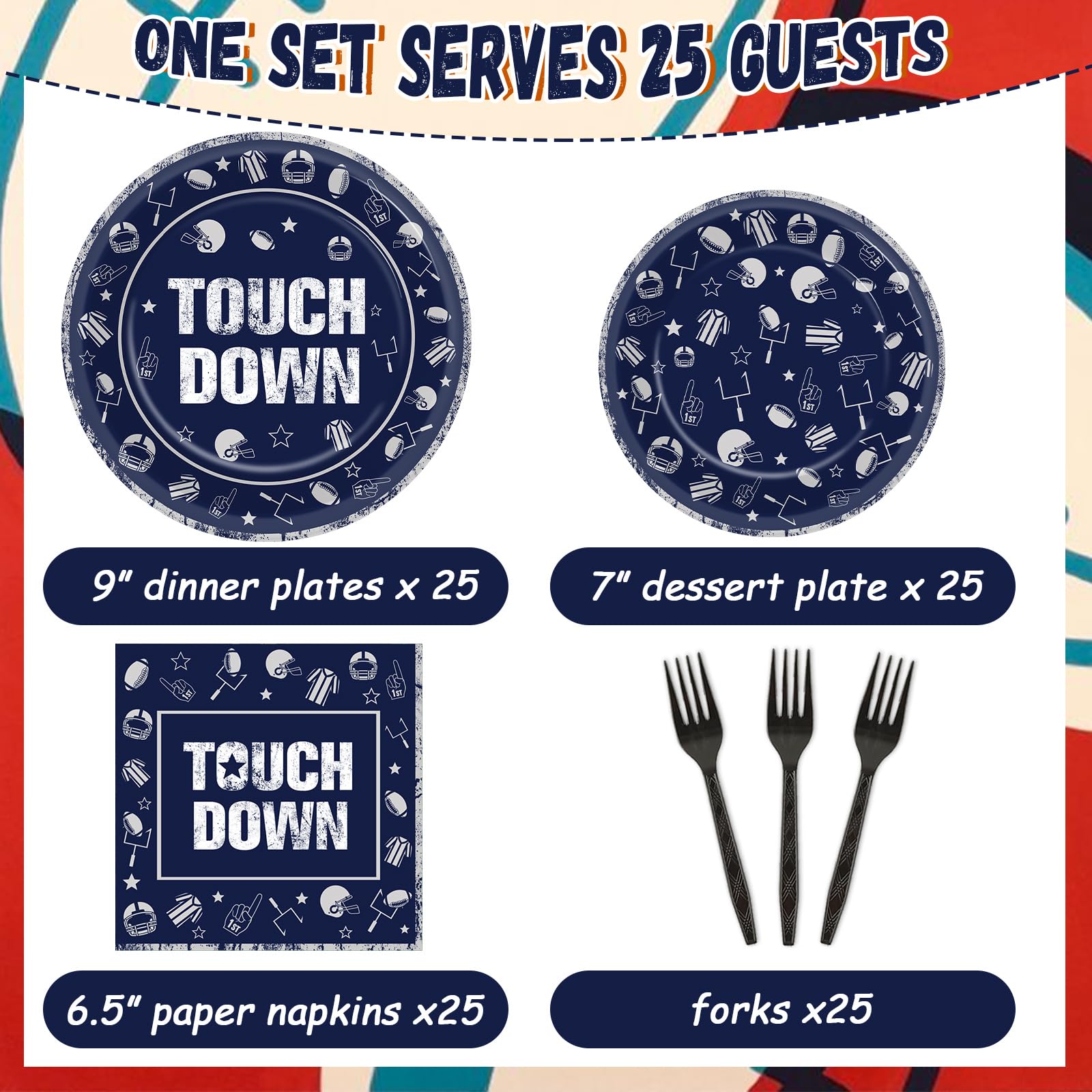 - Q: What is included in the Football Party Plates and Napkins Supplies Kit? A: The kit includes 25 large 9" football plates, 25 small 7" football plates, 25 football napkins, and 25 forks, providing complete tableware for up to 25 guests.