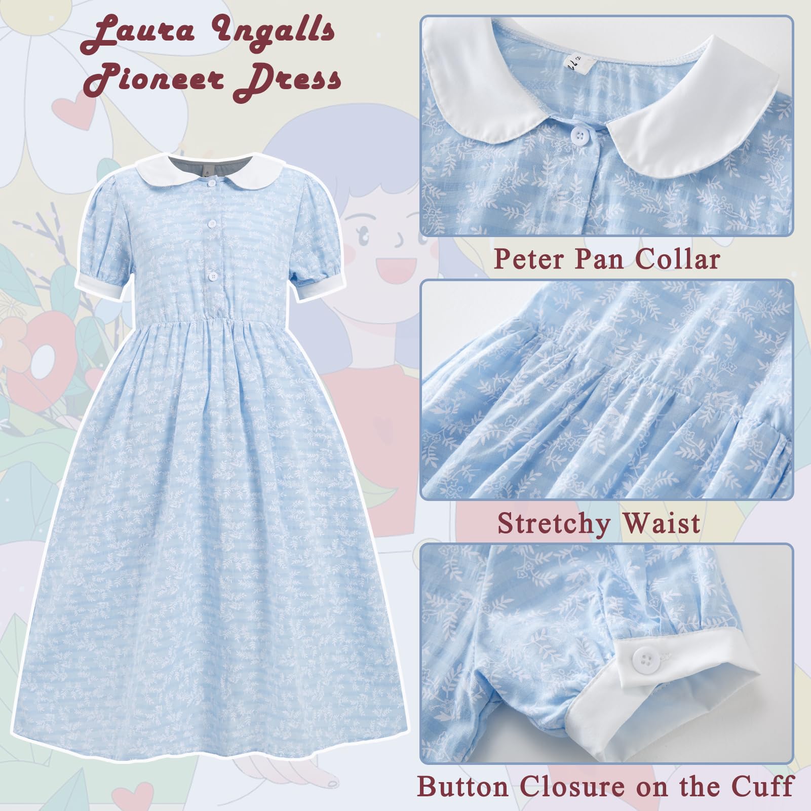 Pioneer Dresses for Girls Colonial Prairie Dress Girls Short Sleeves 1800s Pilgrim Costume with Apron and Bonnet Specifications - Material : Cotton blend fabric - Package Includes : floral pioneer dress + floral pioneer bonnet + white apron - Style : Pioneer, colonial, 1800s, prairie - Characters : Laura Ingalls, pioneer woman Size Chart 4-5Y : Bust:64cm/25.0in --Waist:56cm/22.0in--Shoulder:25cm/9.5in-- Sleeves:17cm/6.5in--Length:75cm/29.5in 6-7Y : Bust:70cm/27.5in --Waist:62cm/24.0in--Shoulder:27cm/10.5in--Sleeves:18cm/7.0in--Length:85cm/33.0in 7-8Y : Bust:76cm/29.5in --Waist:68cm/26.5in--Shoulder:29cm/11.0in--Sleeves:19cm/7.5in--Length:95cm/37.0in 9-10Y:Bust:82cm/32.0in -- Waist:74cm/29.0in--Shoulder:31cm/12.0in--Sleeves:20cm/8.0in--Length:105cm/41.0in 11-12Y:Bust:88cm/34.5in--Waist:80cm/31.5in--Shoulder:33cm/12.5in--Sleeves:21cm/8.5in--Length:115cm/45.0in Pioneer Girl Costume Perfect outfit for Colonial, Pilgrim, Pioneer, and role play and Halloween. Excellent 1800s pioneer trek clothing old fashion dress girls pioneer prairie dress. Notes Manual measurement, please allow slight errors on size. The color may exist slight difference due to different screen displays.
