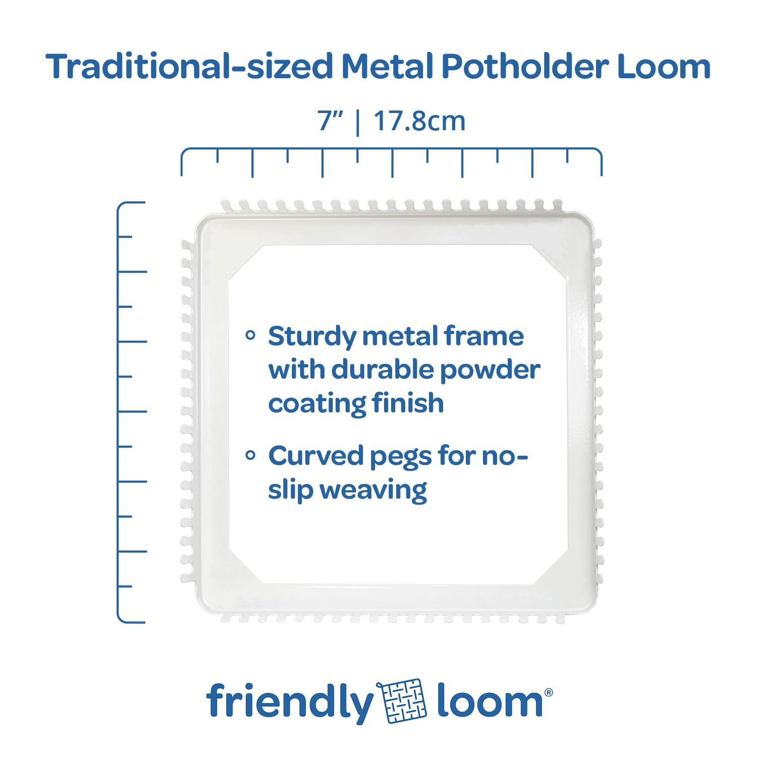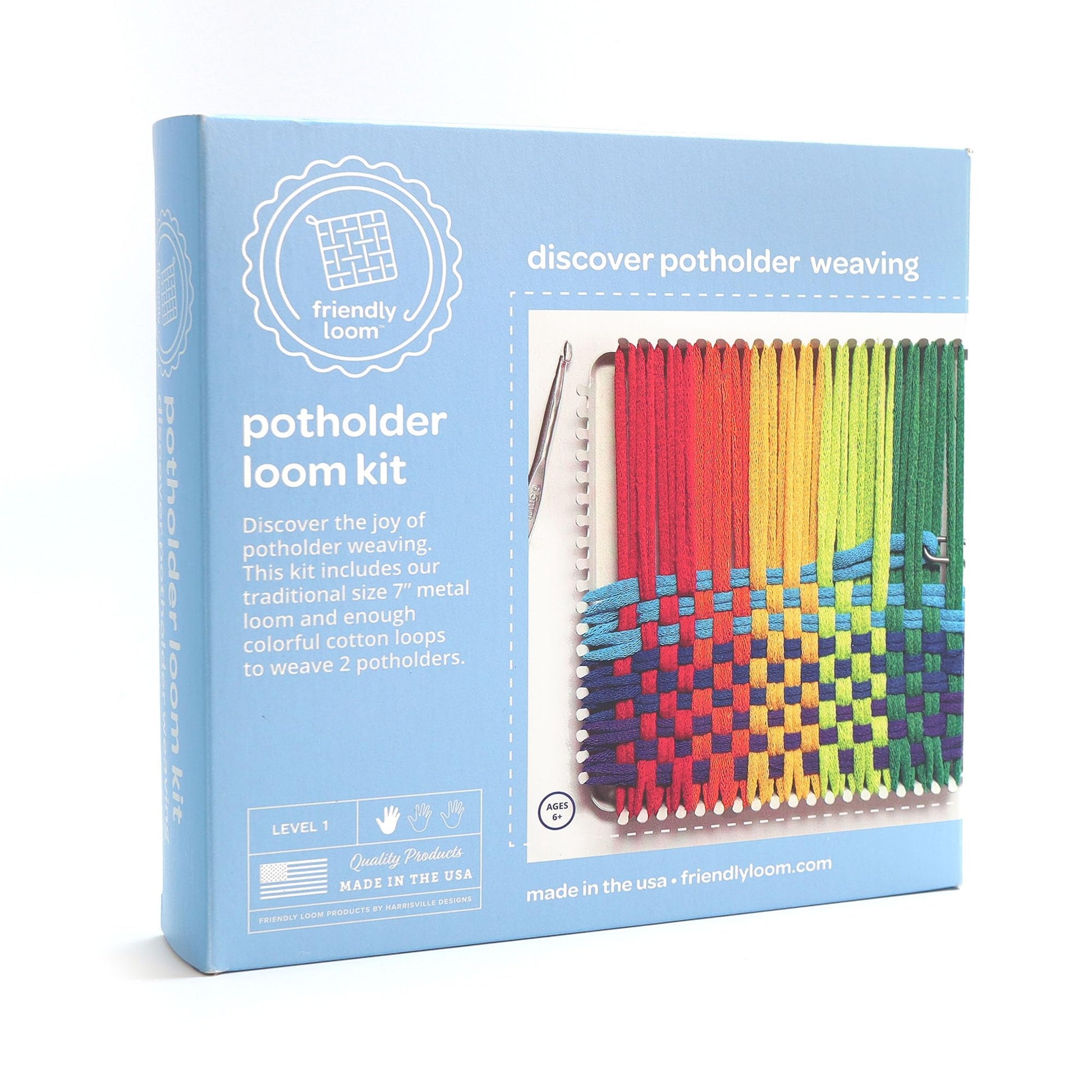 - Q: What materials are used in the Friendly Loom Potholder Weaving Kit? A: The kit is made of sturdy metal for the loom and quality cotton for the weaving loops. This ensures durability and ease of use for crafting.