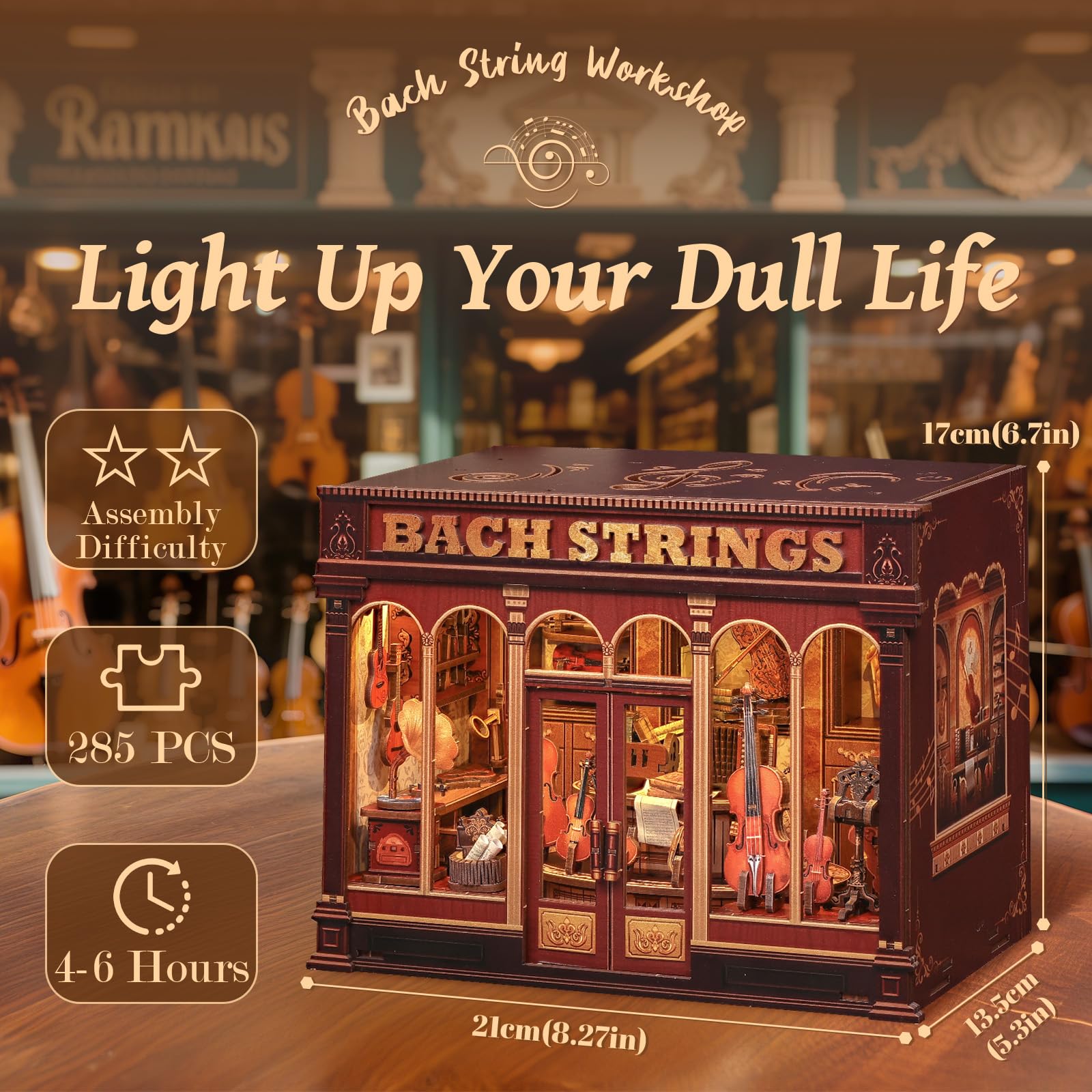 Fsolis Book Nook Kit - DIY Scene Miniature Dollhouse Kit for mature-themeds Shelf 3D Puzzles 285 pcs Tiny House Mini Music Shop Model Booknook Craft Bookshelf Decor Gifts for Women (Bach Strings)