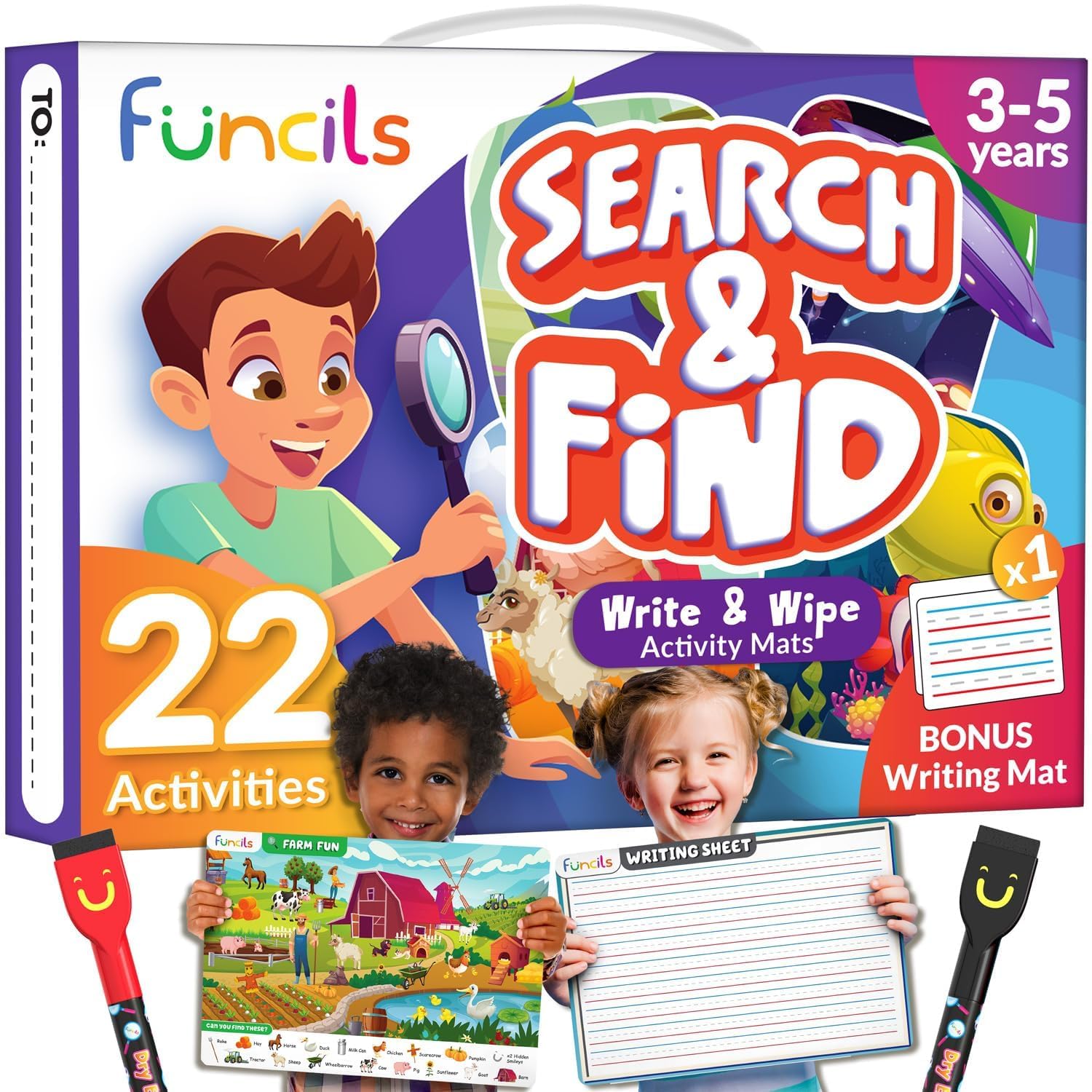 - Q: What types of activities are included in the Funcils Search and Find mats? A: The mats feature 22 repeatable toddler activities, including tracing mazes, puzzles, counting exercises, shadow matching, and spot differences, offering a variety of engaging educational experiences.
