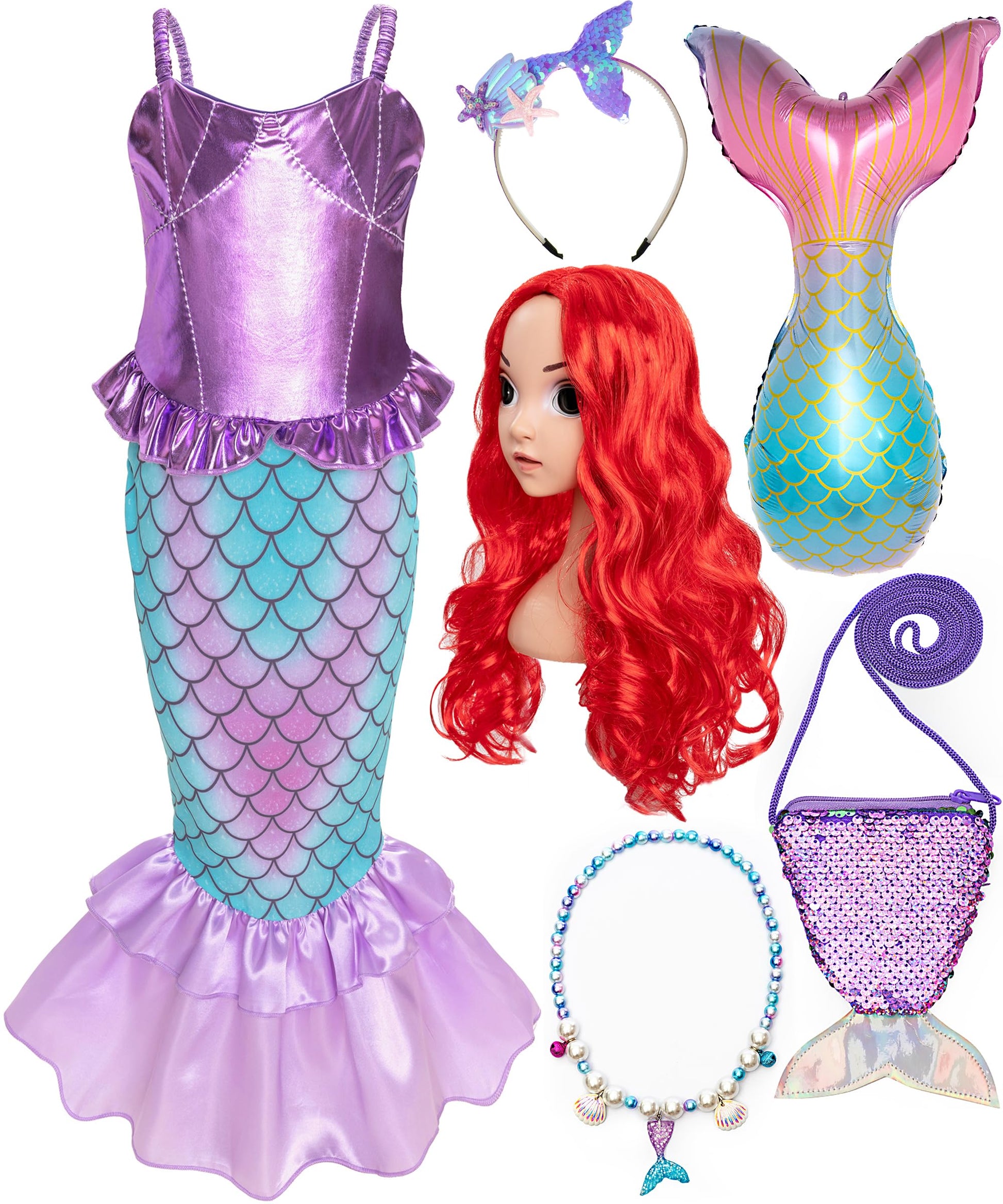 FUNNA Princess Dress Let Your Little Princess Grow Up with Fun! Mermaid skirt with fish scales Made from gorgeous soft polyester Includes with mermaid dress, red wig, mermaid tail coin purse, headband, necklace, mermaid balloon and hand pump Dress up your little girl to be the most eye-catching princess Perfect for special occasions, birthday, dress up, halloween, role play and special occasions. Care Instructions: Handwash with cold water, line dry.
