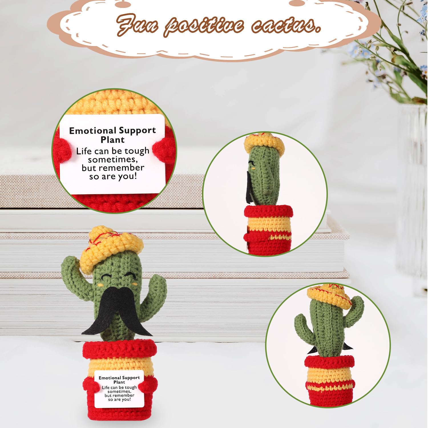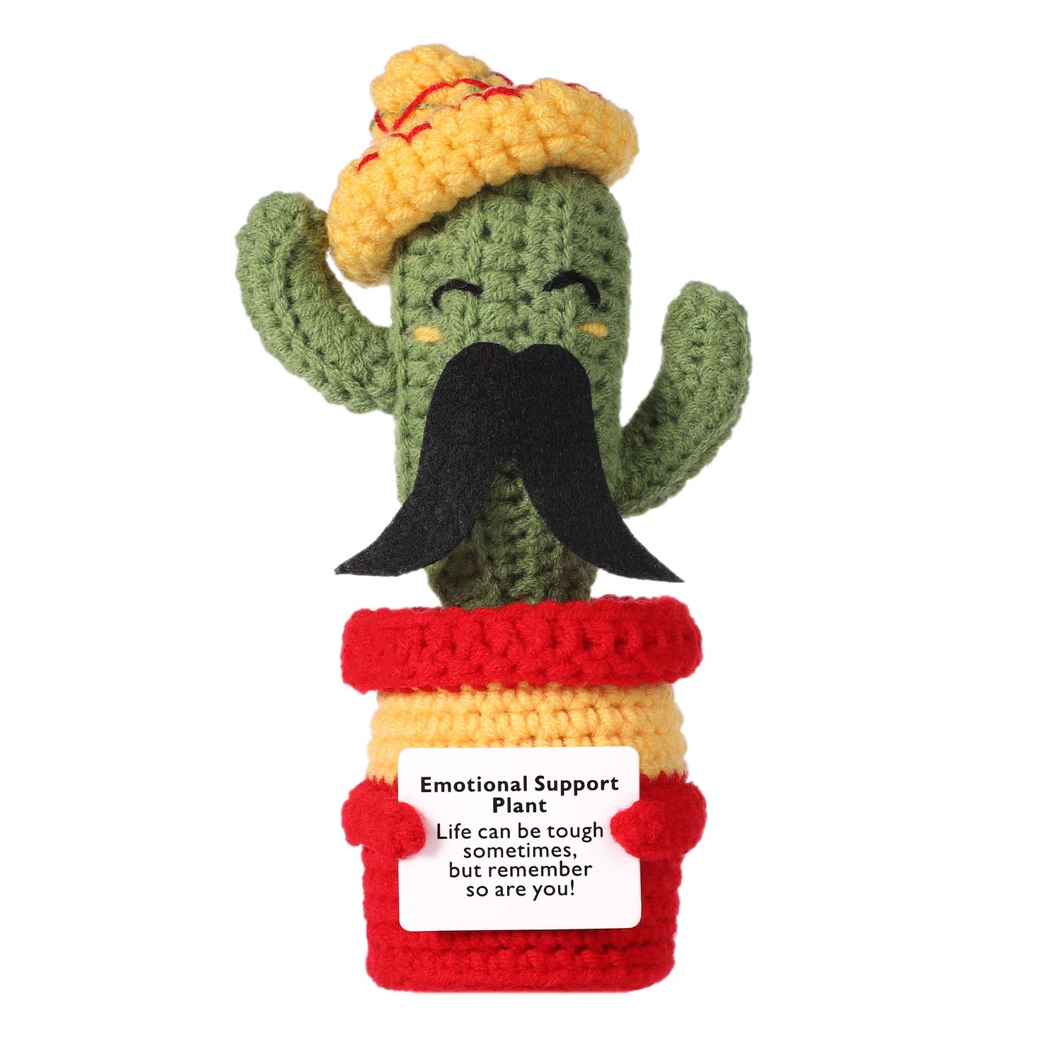 - Q: Does the cactus come with anything special? A: Yes, the cactus plush toy comes with an encouraging card attached, featuring warm words of support that can uplift anyone feeling down.