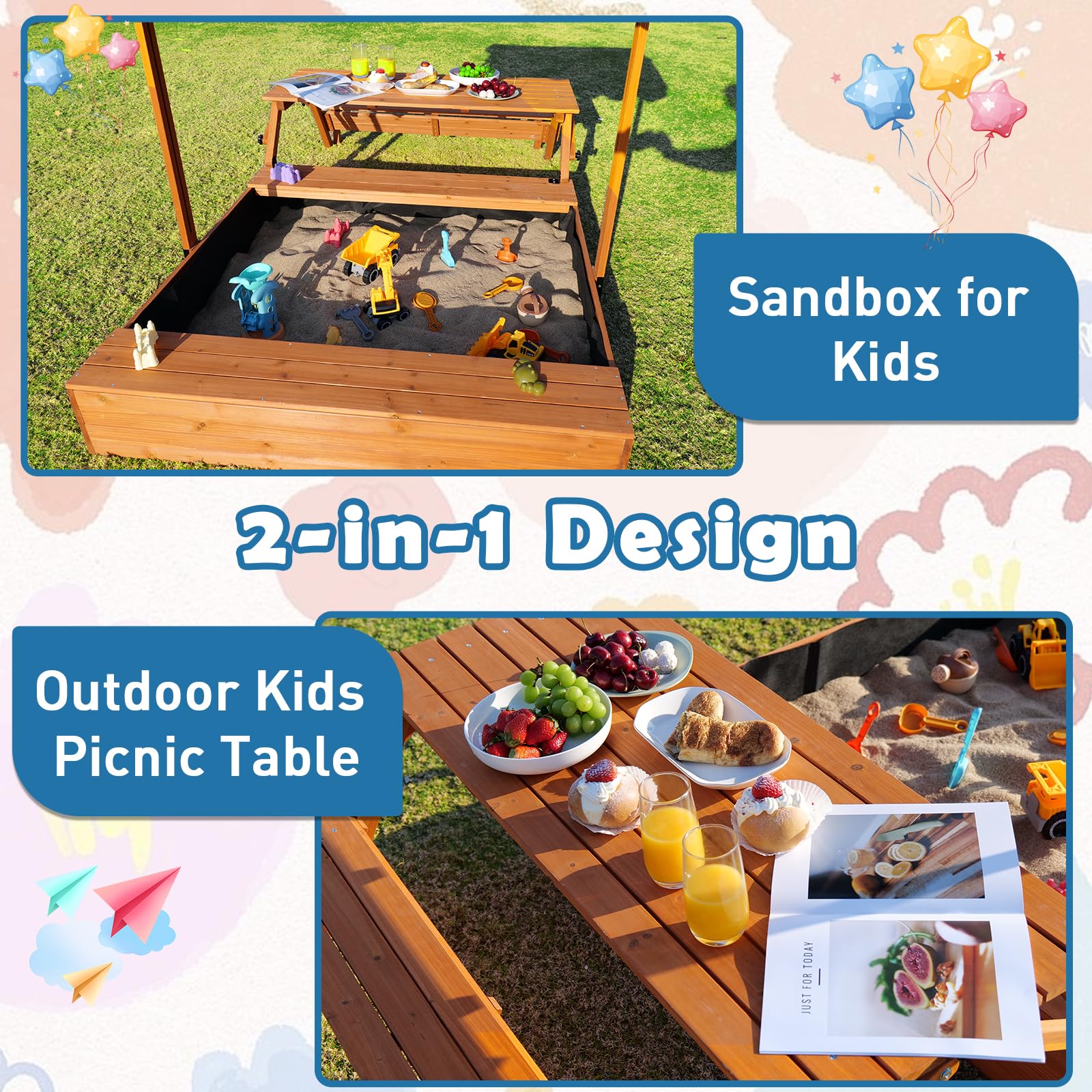 Funxplore Wooden Kids Sandbox With Lid, Outdoor Sand Box With Picnic Table, Sandpit With Cover Canopy For Aged 3-8 Years Old, Ad