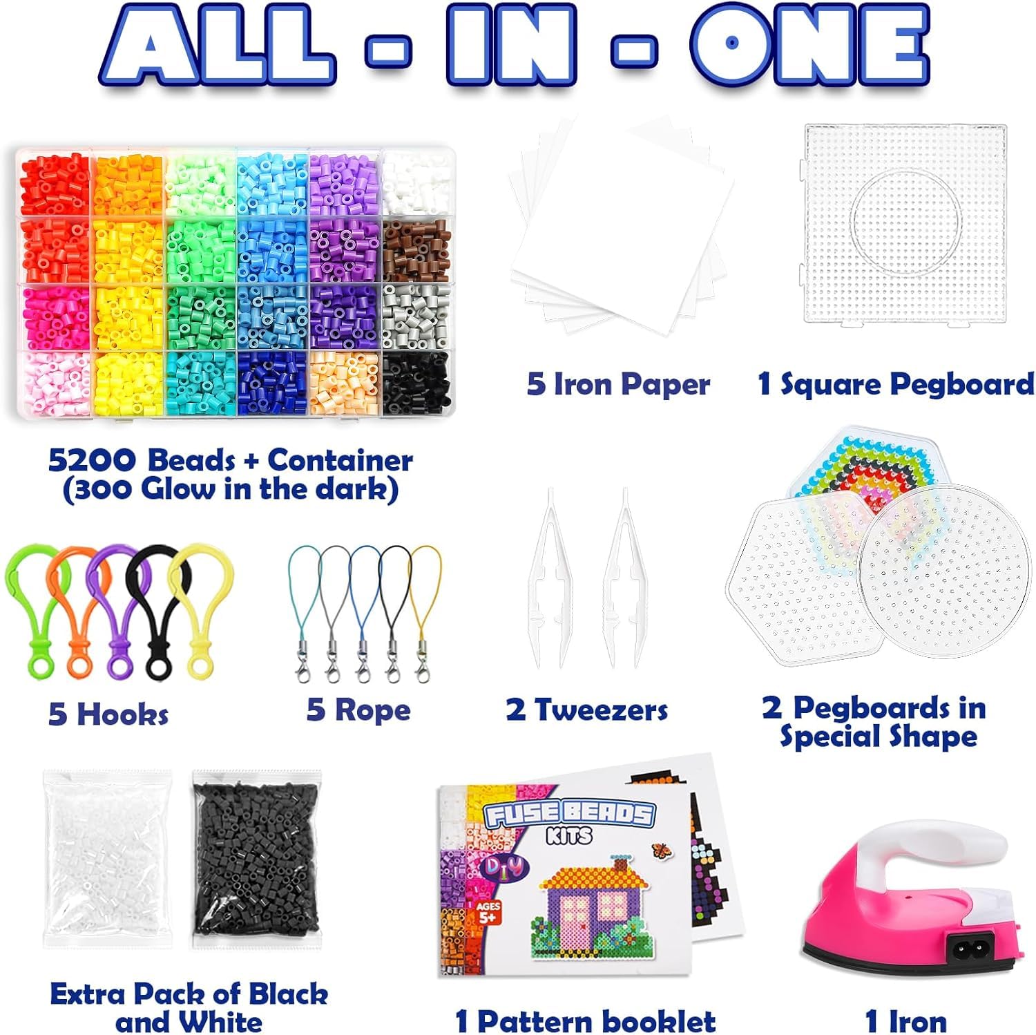 FUNZBO 5200 5mm Fuse Beads Kit with Mini Iron - 24 Colors | 111 Patterns, Easter Arts and Crafts for Girls and Boys, Kids Toys S