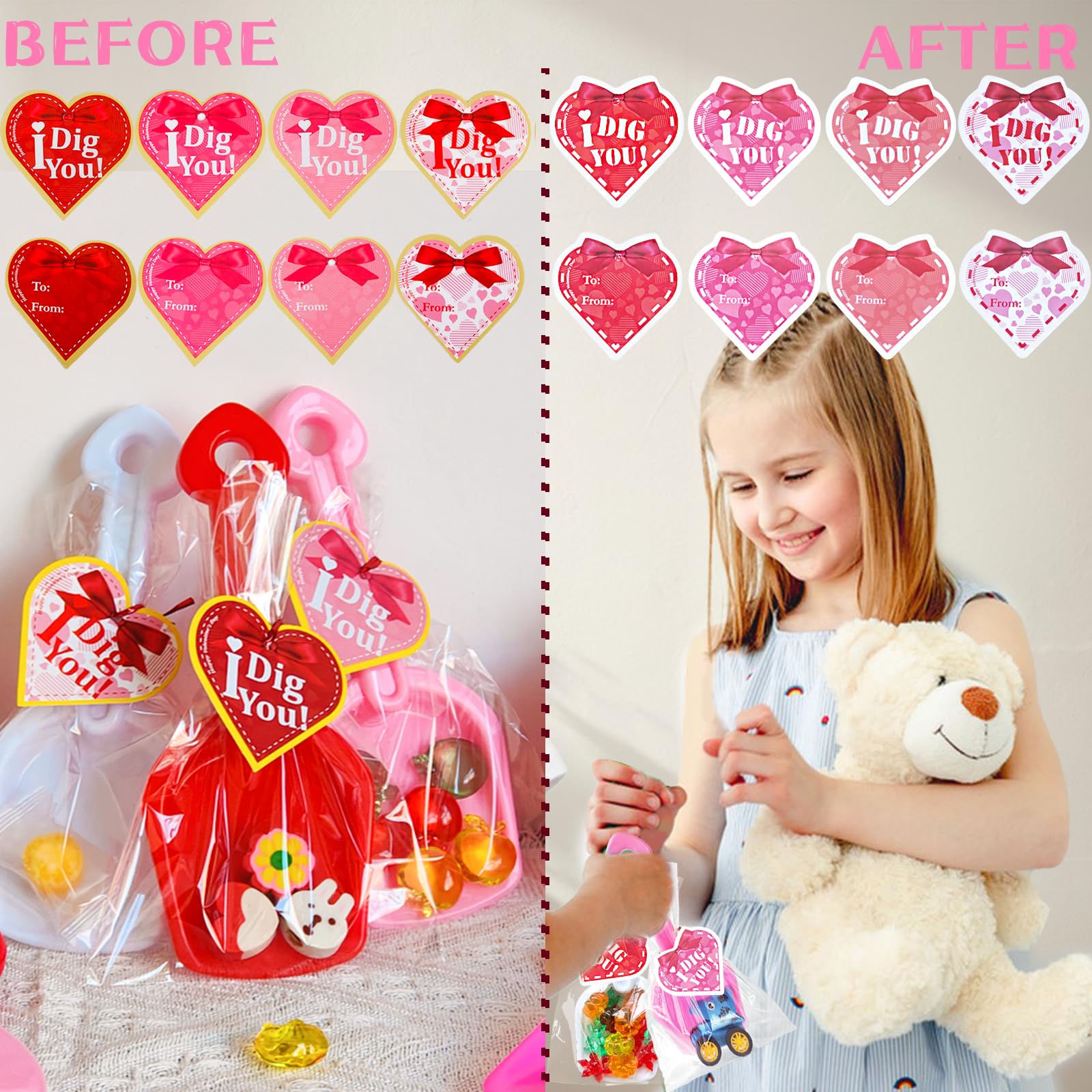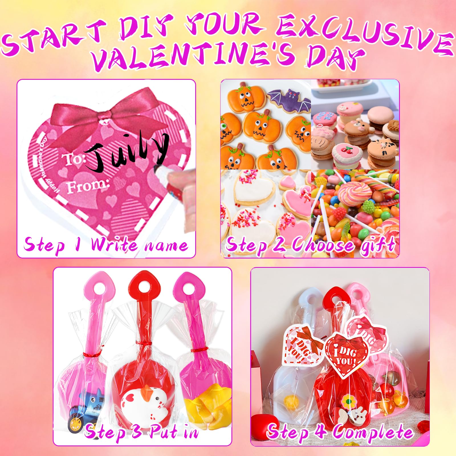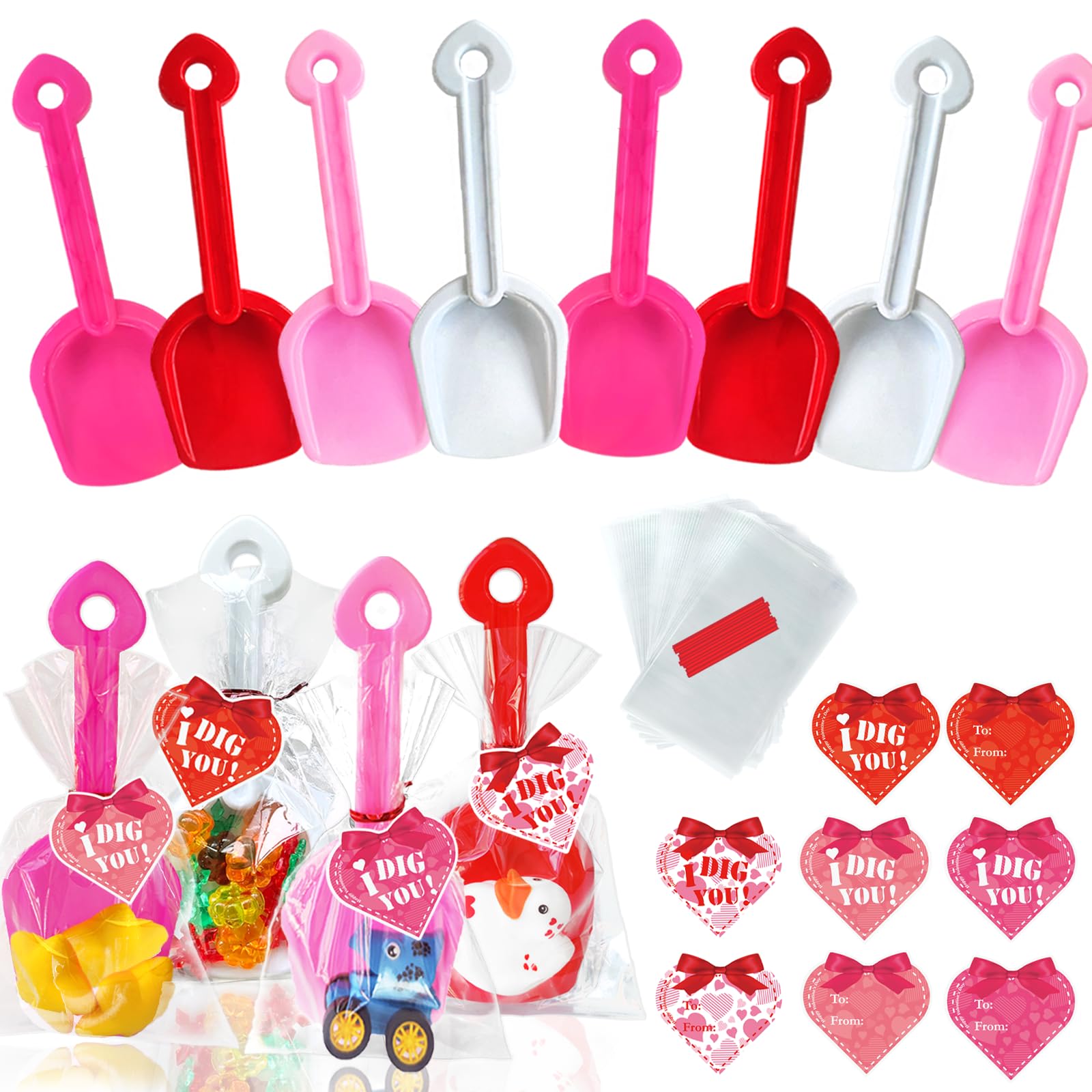 Package includes: 28 pcs shovels,7.6''x3.0'' 28 pcs I DIG YOU heart cards,2.3''X2.3'' 30 pcs bags,7.0''x4.7'' 30 pcs red wires,3.9'' Bright Color: 4 colors,red,white,pink and rose red,echoing the holiday theme. Fun to use: You can not only put toy shovels into the bags,but also add some snacks or toys into it. Applications: The plastic shovels can be a funny valentines gift for kid or friends while say ''I Dig You''.Or used as a sand shovel toy.And suitable for Mother's Day,birthday party,weddings,and etc.