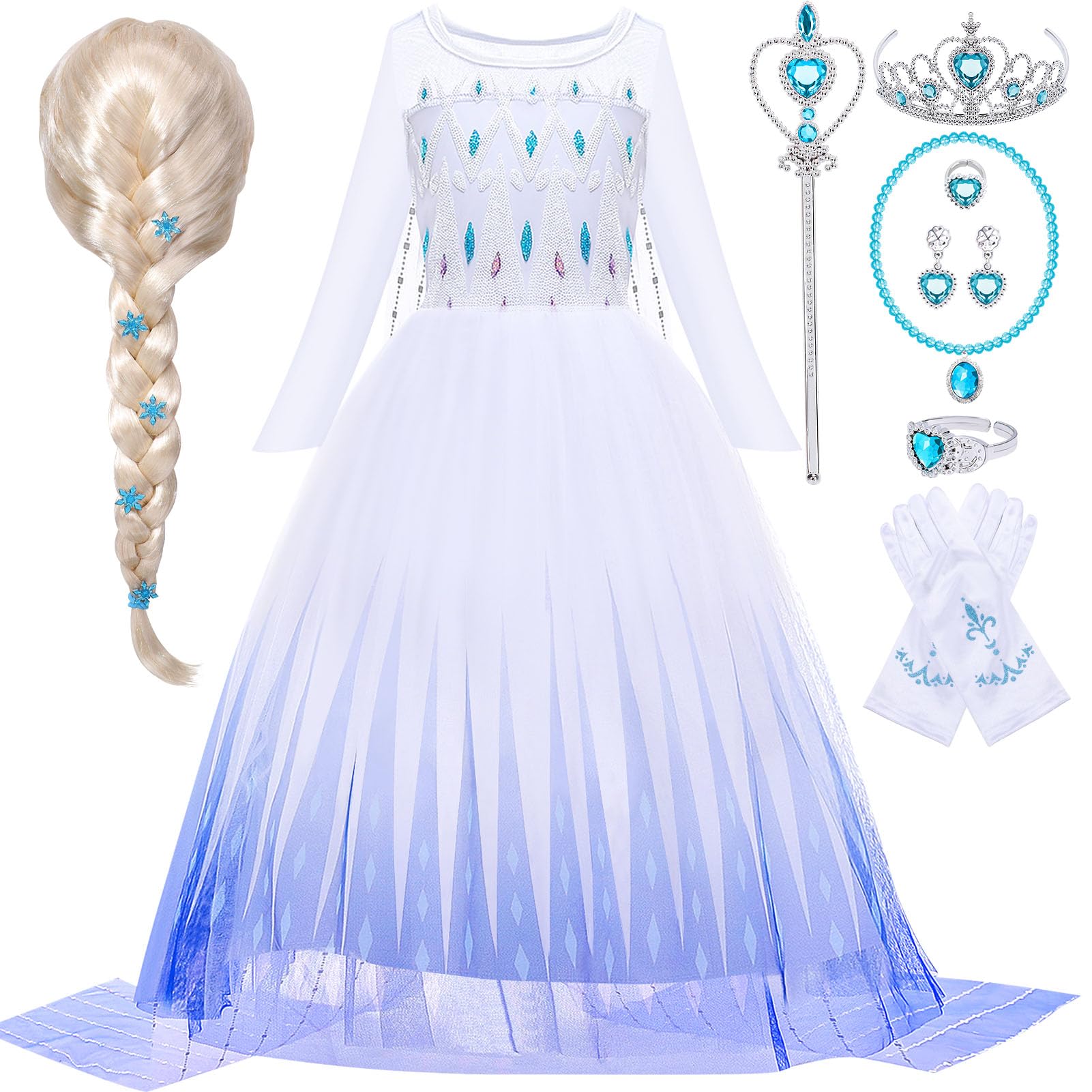 G.C Elsa Dress Costume For Girls Toddler Princess Dress Up Clothes With Cape Crown Wig Gloves Wand Necklace Accessories Toys Halloween Cosplay Birthday Party Favors For Girls Aged 3 4 5 6-10