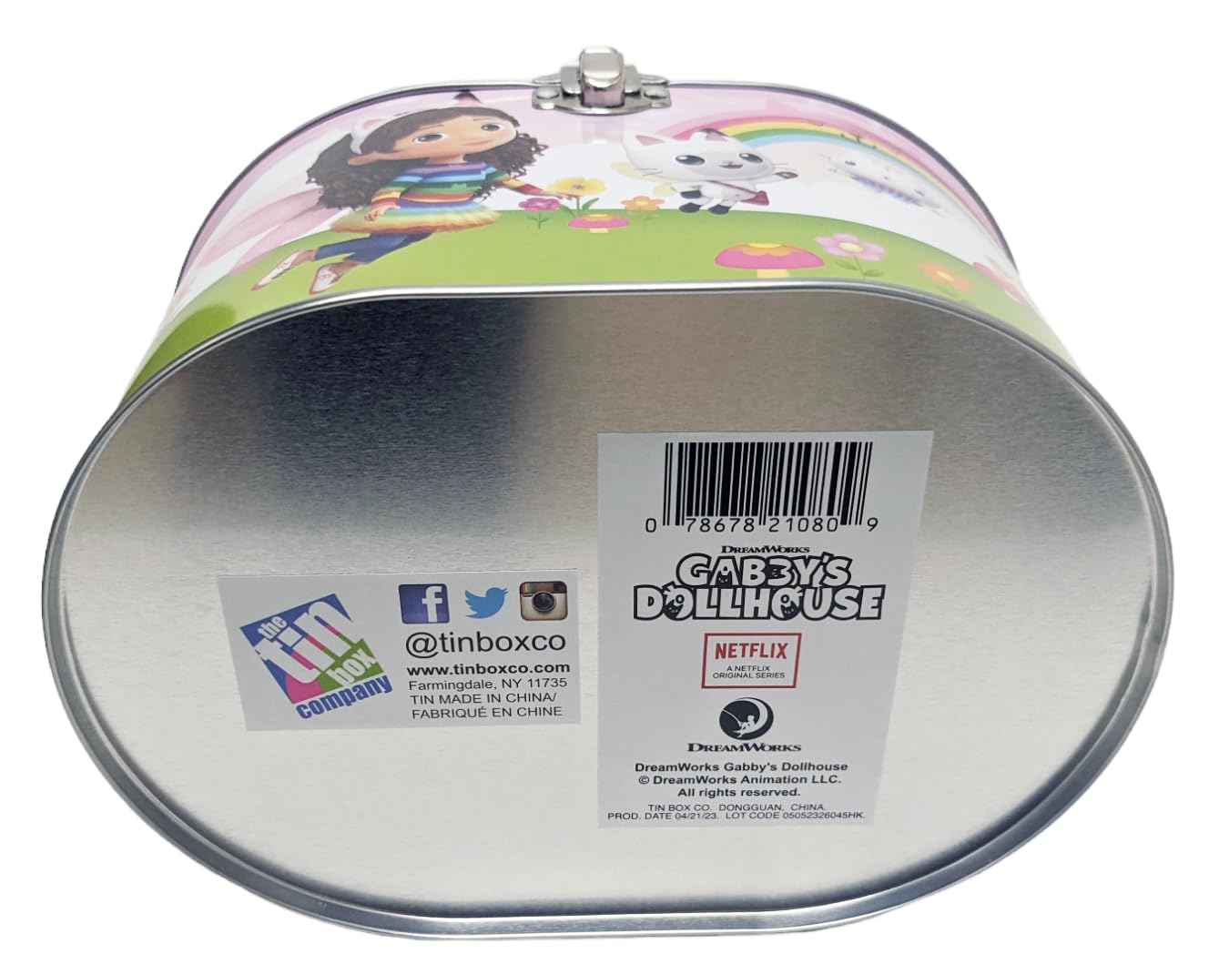 - Q: What materials are used in Gabby's Dollhouse Oval Tote? A: The Gabby's Dollhouse Oval Tote is made from tin plate steel and features a plastic handle, ensuring durability and a stylish design.