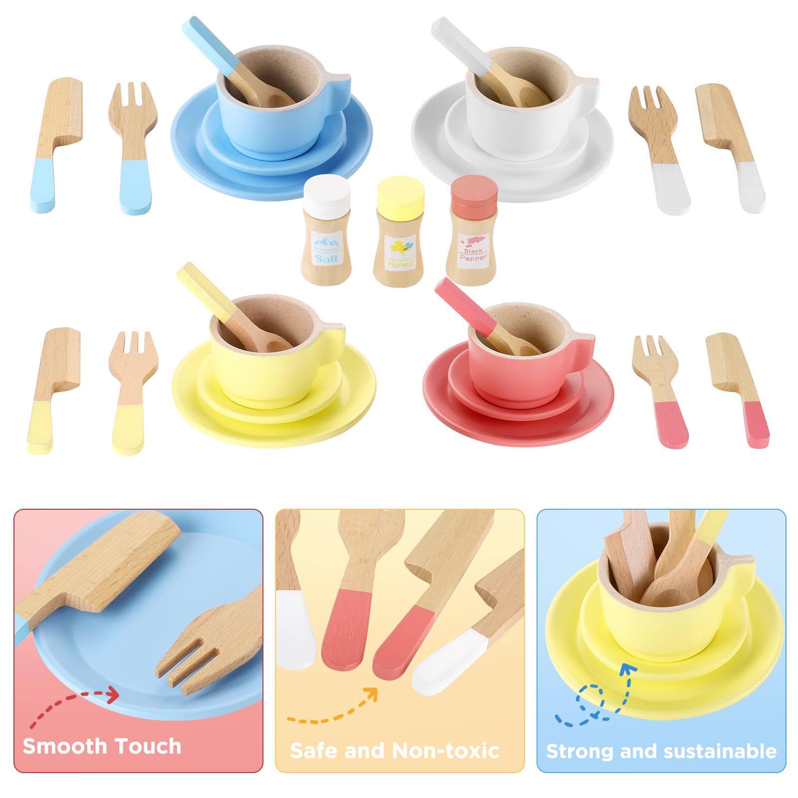 GAGAKU Wooden Play Dishes and Plates for Kids Kitchen Set 27 PCS Montessori Wooden Play Kitchen Accessories Kitchen Toy Wooden P