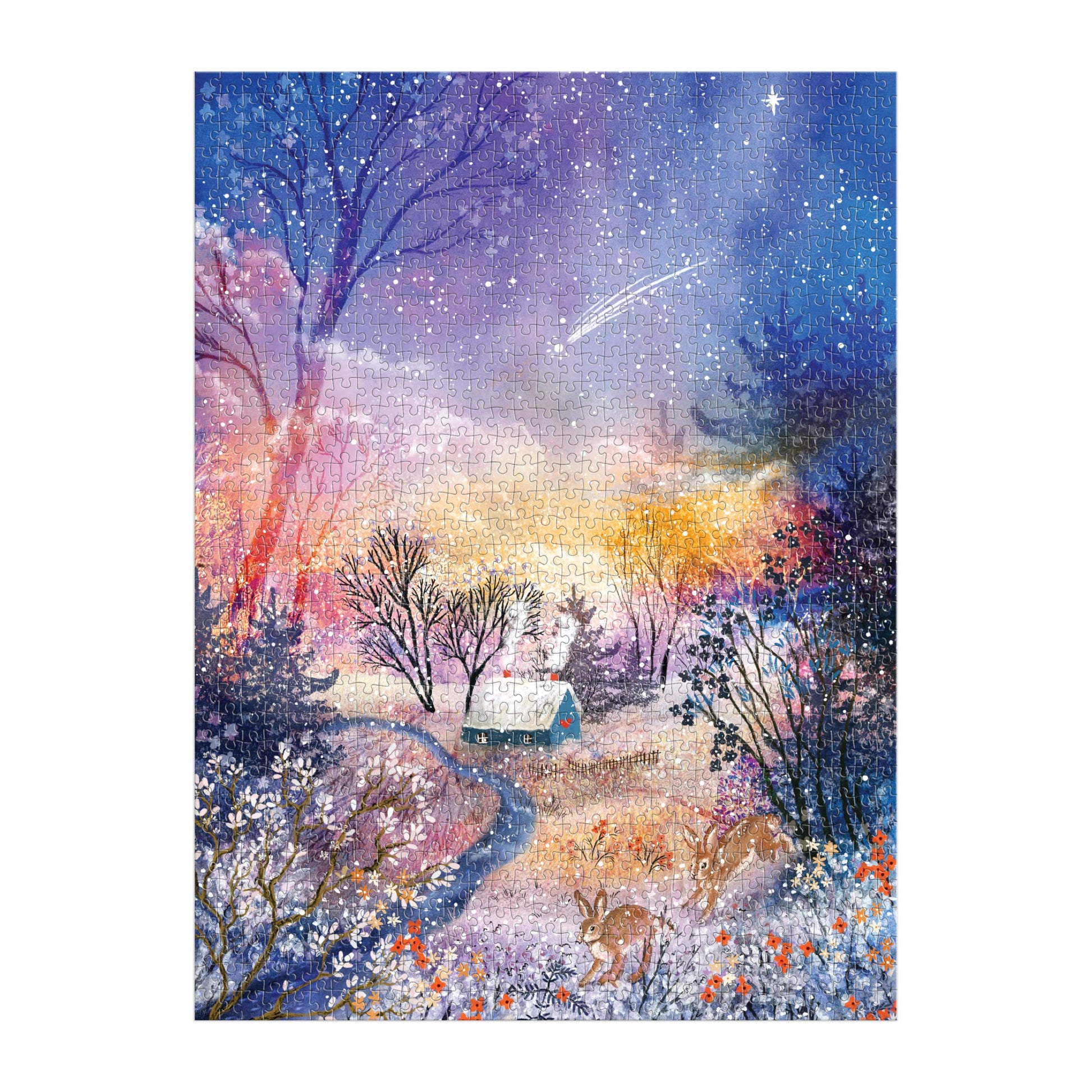 The Enchanted Snowfall 1000 Piece Puzzle features a snowy winter landscape lit with a supernatural, starry sky.