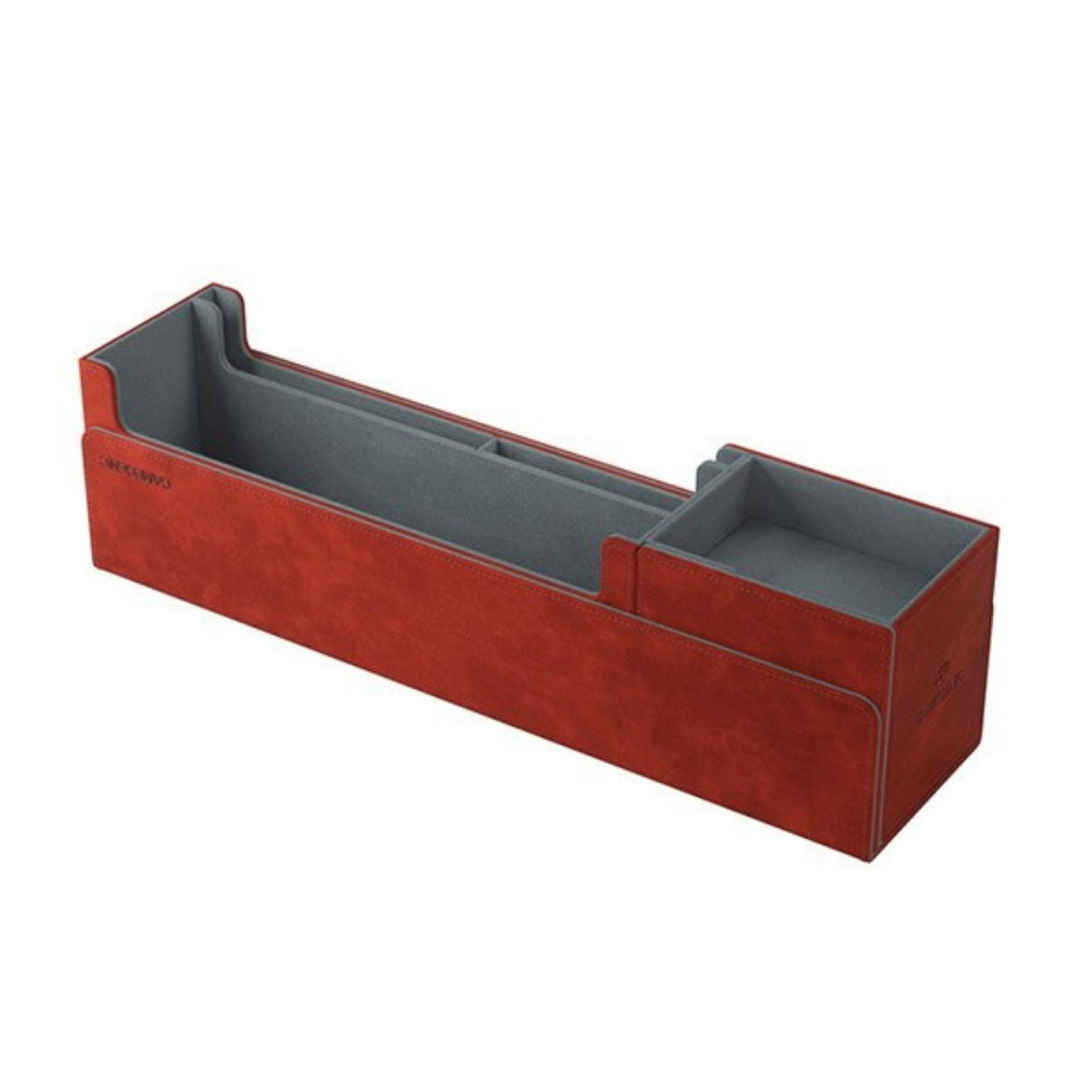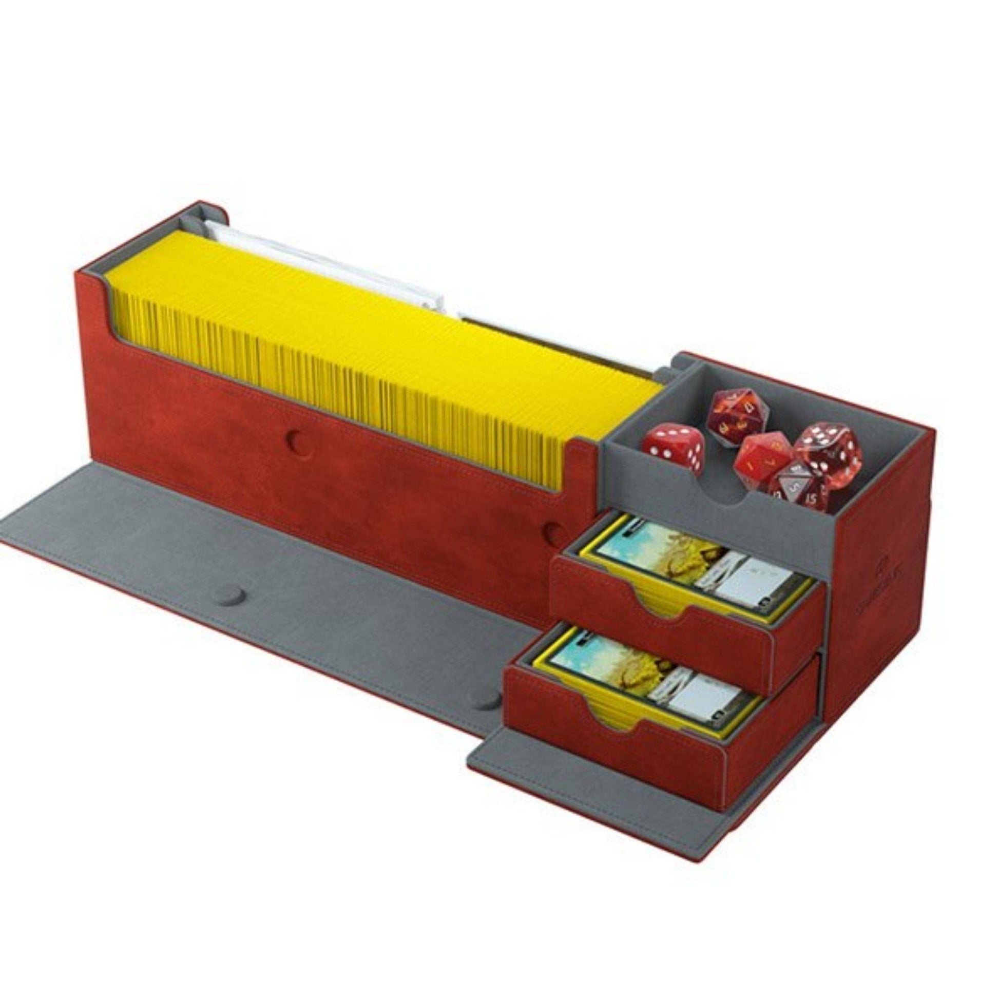The next BIG thing! This is what many customers have been waiting for: a large enhanced box for the purpose of perfectly fitting standard- sized cards in sleeves. With the additional innovative features this is all you need for your collection on a great gaming night and perfect for a vast variety of games and needs. This multifunctional enhanced box is designed to perfectly fit 400+ double-sleeved or 540 board game sleeved cards*. The optimized design keeps the cards in position preventing them from shifting around. Two removable hidden drawers with ingenious magnetic flaps provide easy access to tokens dice or even sleeved cards or full decks e.g. Marvel Champions KeyForge etc. Furthermore the top compartment of the Cards Lair can be used to store played cards accessories or as a mini dice tray. Additional game-style on the side are ideal for sleeved oversized cards and standard life pads/writing pads. To save space on the gaming table remove the lid and clip it to the bottom. Moreover the powerful magnets and the innovative closing mechanism keep the Cards Lair safely closed even if the box is shaken upside-down.