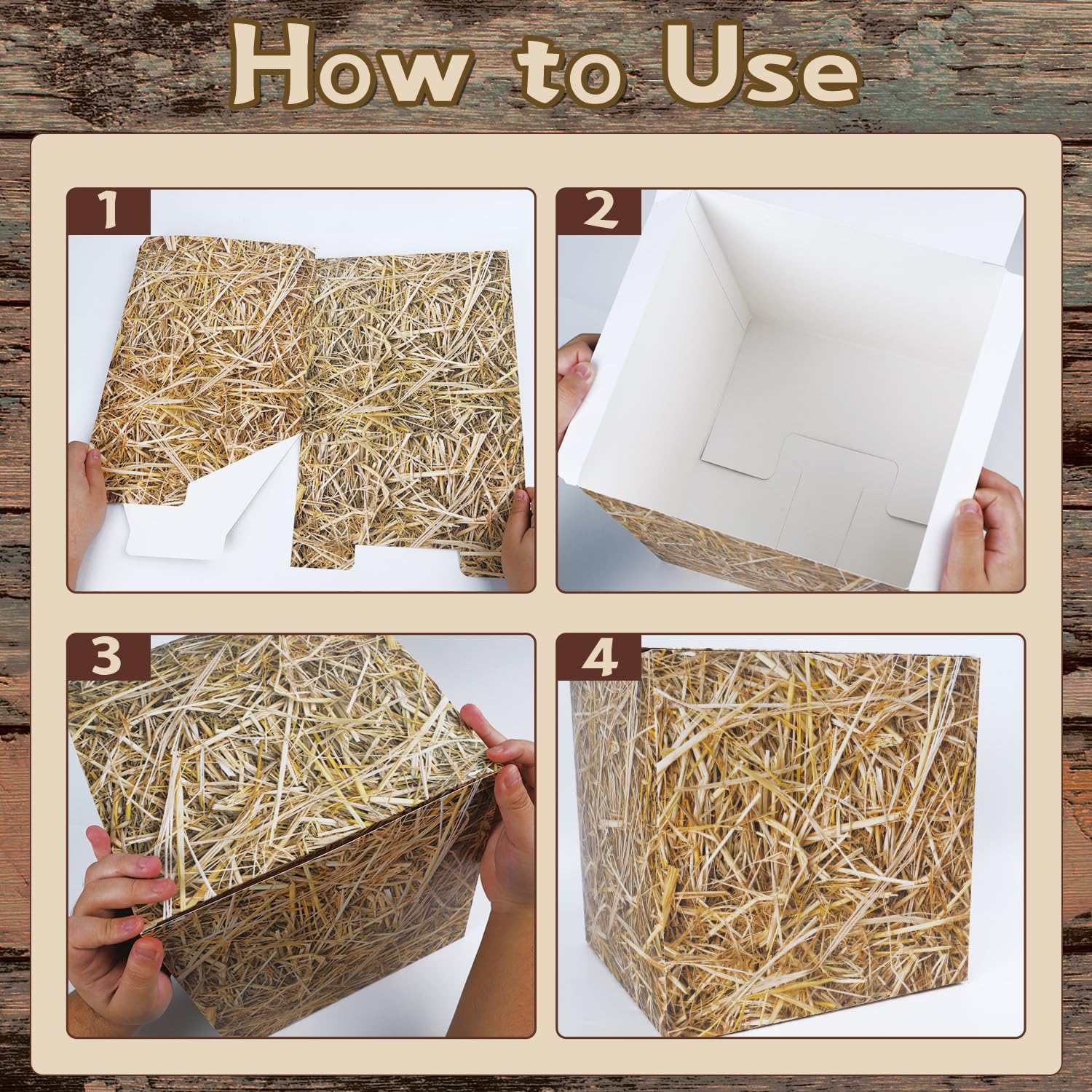 Western Style: This cowboy party themed decoration set includes 4 hay bale boxes, 2 wooden boxes, 2 wheel cards and 1 cowboy boot card, which perfectly captures the rugged and free spirit of the cowboy. Paper Material: The hay bale box uses sturdy cardboard and real straw texture, and the wheel and cowboy boot cards are beautifully designed to ensure the durability and authenticity of the decoration. Easy to Arrange: The hay bale box can be turned into a three-dimensional square box with simple assembly and placed on the ground to quickly arrange a party scene full of western style.