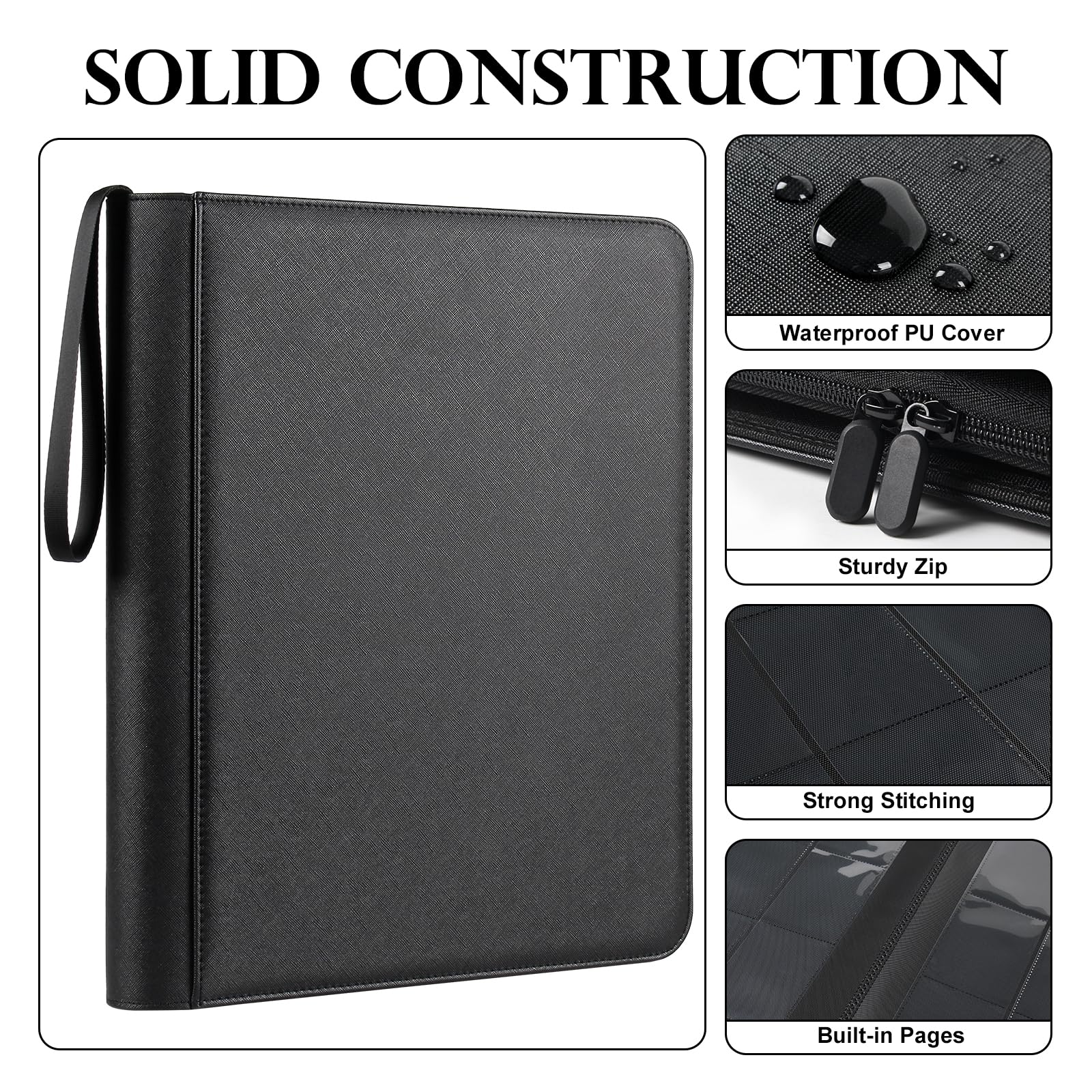 Our top loader binder offers a balance of durability capacity protection and style it is ideal for the card collector who is serious about keeping his top prized possessed cards safe and secure. It not only enhances the security of your collection but also makes sales and trades easier. Compared to the card storage box you can carry it to card show or trade days easily and no more worrying about damage. With our card binder your collection is not only impeccably organized but also displayed with pride. Our binder for top loaders can hold up to 324 toploader cards. It is designed for collectors who have tons of nice sports cards or collectible cards in top loaders that just sit in boxes. With this waterproof protective card binder you are able to bring with to card shows or trade days. We use enhanced PU leather to make this top loader binder to make it provide top-grade protection for your prized cards. It can protect your cards from dust scratches moisture and bending. The zip closure ensures that your card will never be accidentally lost. The side-loading pocket design makes it easier to get the cards in and out of the pages. And it allows you to turn the binder upside-down without all cards falling out. The card sleeves are made from acid-free non-PVC archival-safe materials which can prevent your card's degradation and fading. The excellent material can keep cards in pristine condition. This binder is designed for 3 ? 4 rigid top loader. It is a breeze to slide in cards and the snug fit ensures the cards stay securely in place. No more worry about the card slide around in the pocket. The widened spine design can prevent cards from bending when the collection binder is full. And you can lay flat the binder when loaded so you can admire your collection with ease without having to dig through a box. Package Includes: 1 ? Top loader binder 2 ? Sticky labels 1 ? Semi-transparent sticky note